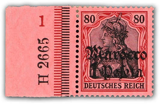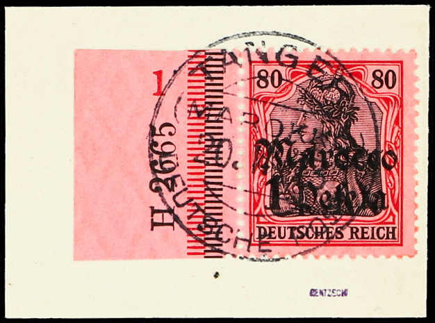 1911, 1 P. auf 80 Pfg. Aufdruckausgabe dunkelrötlichkarmin/schwarz auf mattrosarot, klar gestempelt "TANGER (MAROKKO) 20.11.13", vom linken Bogenrand mit Ur-HAN 2665, farbfrisch, einwandfrei, gebraucht sehr selten!, signiert Gentzsch,