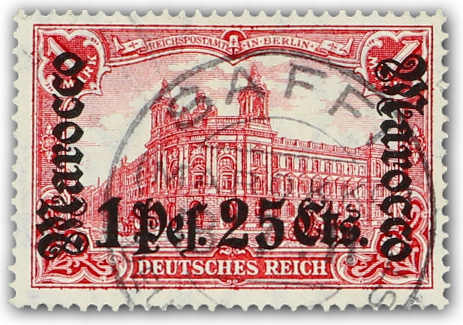 1906, 1 P. 25 C. auf 1 M. dunkelkarminrot, entwertet "SAFFI MAROKKO DEUTSCHE POST 18.7.11", farbfrisch und gut gezähnt, mehrfach sign., u.a. Bothe BPP und Kilian BPP, einwandfrei (ME 440,-) (Image)