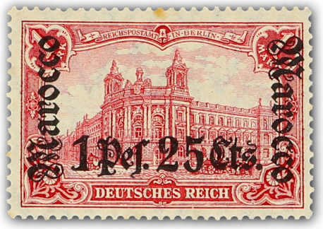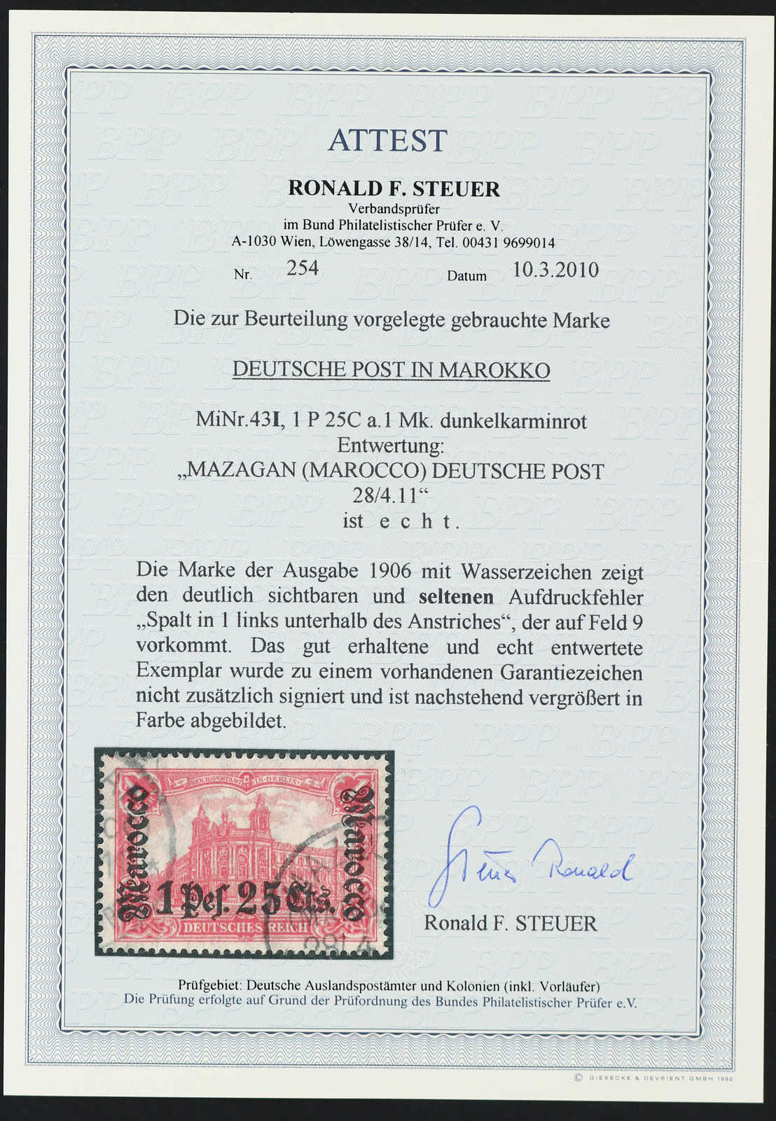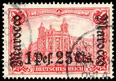 1906, 1 P. 25 C. auf 1 M. Aufdruckausgabe dunkelkarminrot mit Aufdruckfehler "Spalt in 1 links unterhalb des Anstriches", sauber gestempelt "MAZAGAN (MAROCCO) DEUTSCHE POST 28/4.11", gute Qualität, signiert, Fotoattest Steuer BPP (ME