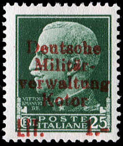 Zahnspitze der beiden oberen Marken braunfleckig, sonst einwandfrei, Auflage des Aufdruckfehlers nur 50 Stück, Fotoattest Huylmans BPP 05/2023 (ME 3.200,-)