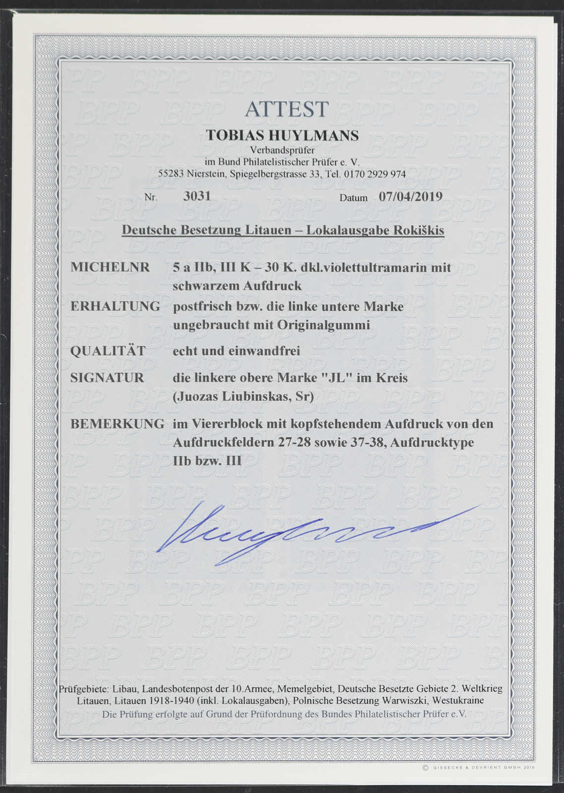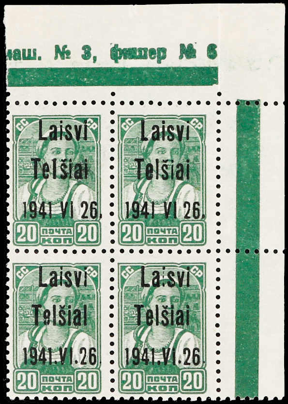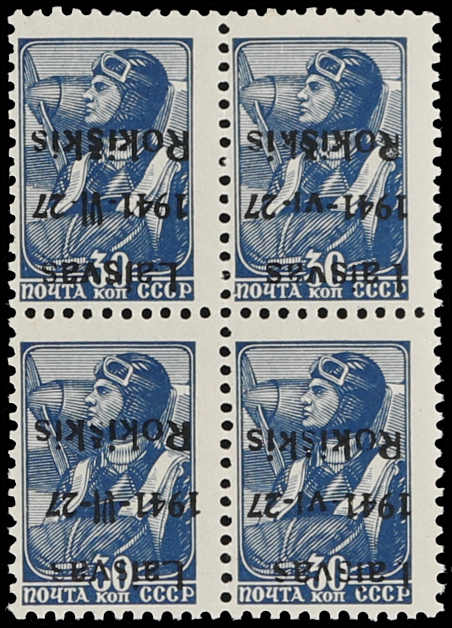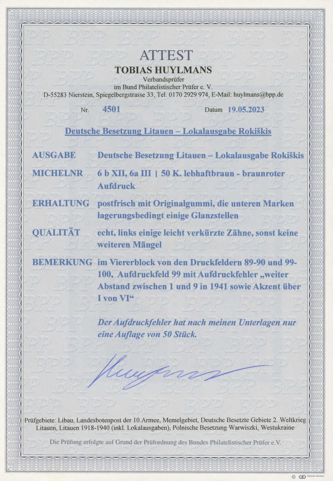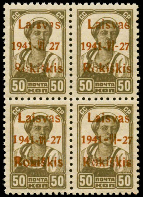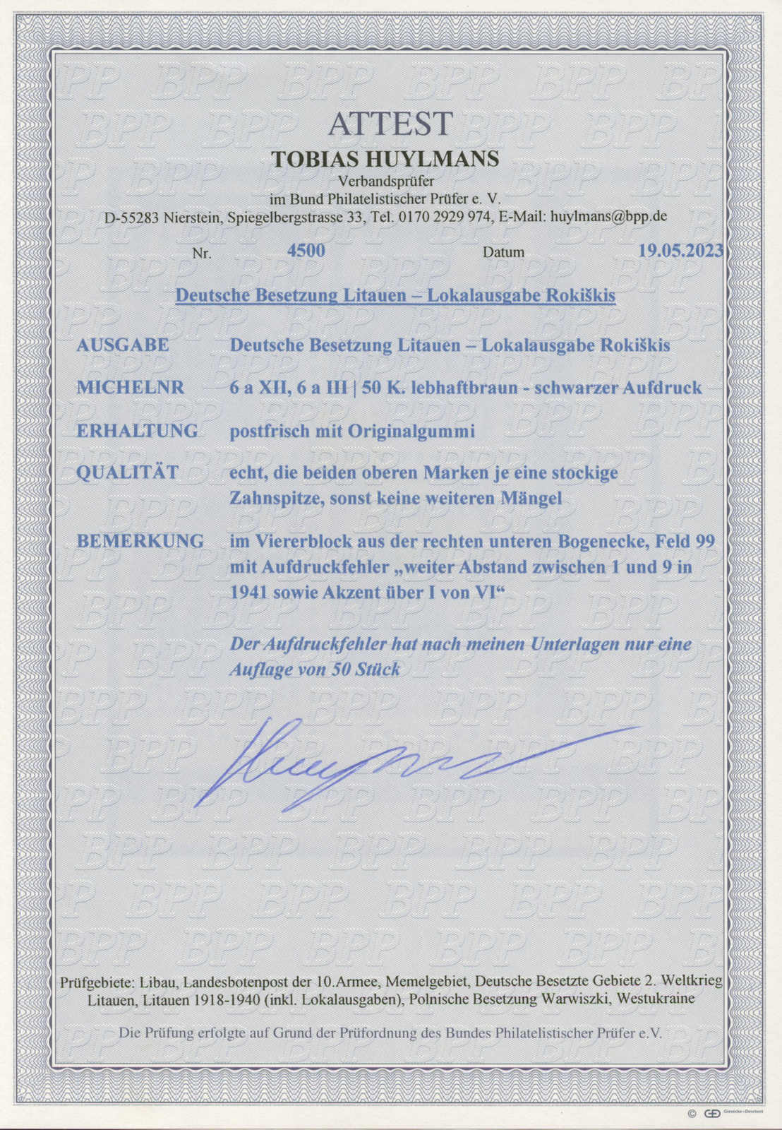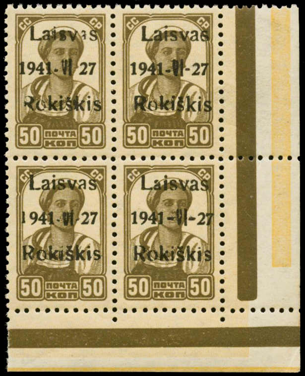 1941, Lokalausgabe Rokiskis, 50 Kop. mit schwarzem Aufdruck im Viererblock aus der rechten unteren Bogenecke (rechts unten kleiner Eckbug), dabei die linke untere Marke mit dem Aufdruckfehler XII, postfrische Originalgummierung, je eine