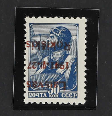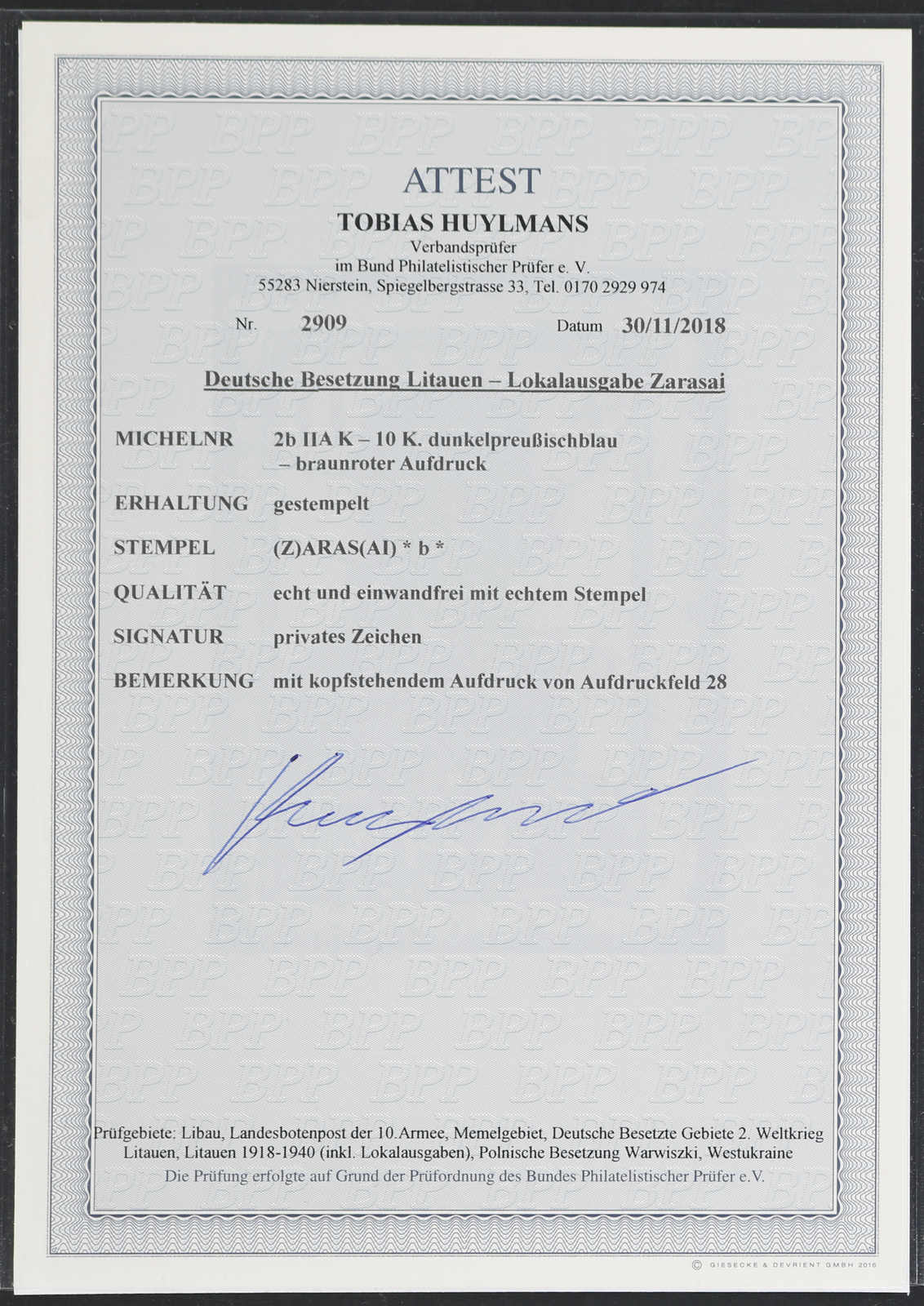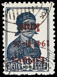 1941, 10 Kop. Werktätige, gest. Einzelwert mit dem braunroten waager. Aufdruck in der Aufdrucktype II A kopfstehend, entwertet "(Z)ARAS(AI) *b*", farbfrisch und gut gezähnt, einwandfrei, Fotoattest Huylmans BPP 11/2018 (im Michel ohne