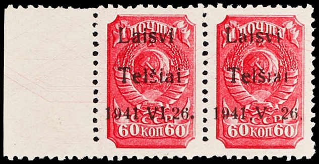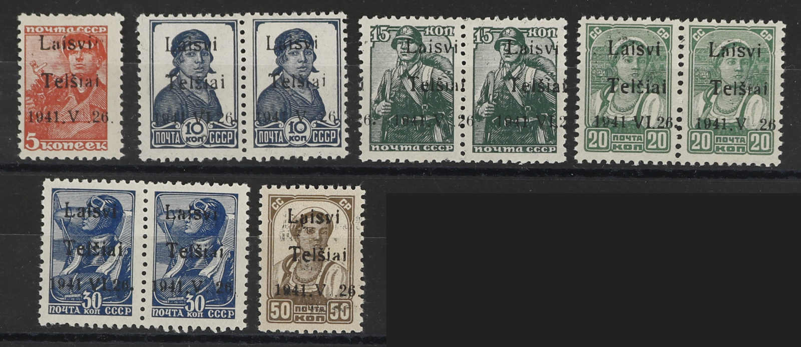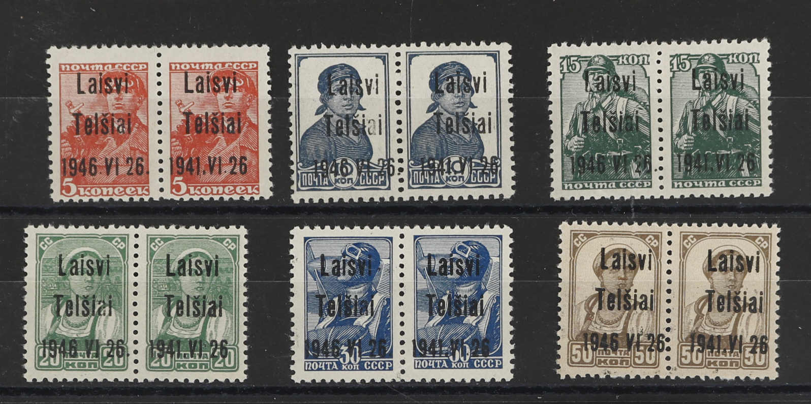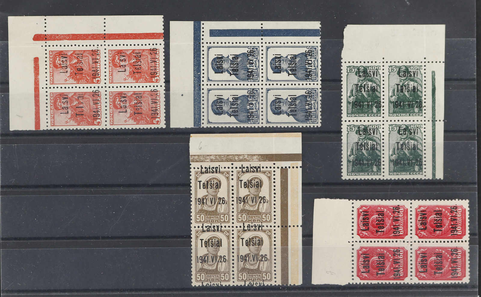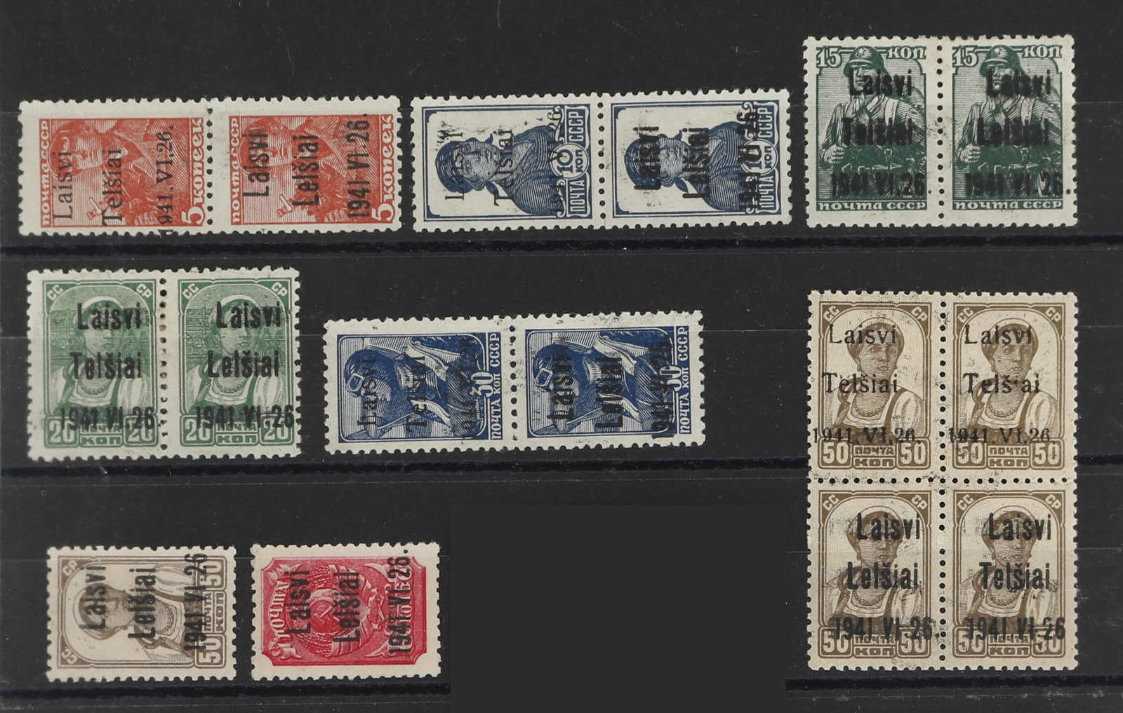 1941, 5 bis 60 Kop. Werktätige, 18 ungebr./postfrische Werte, teils in senkr. Typenpaaren und einem 4er-Block, dabei immer ein Wert mit dem Aufdruckfehler "Lelsiai statt Telsiai", rückseitig meist Falzreste, zwei Werte postfrisch, alle