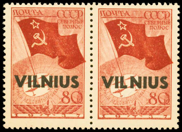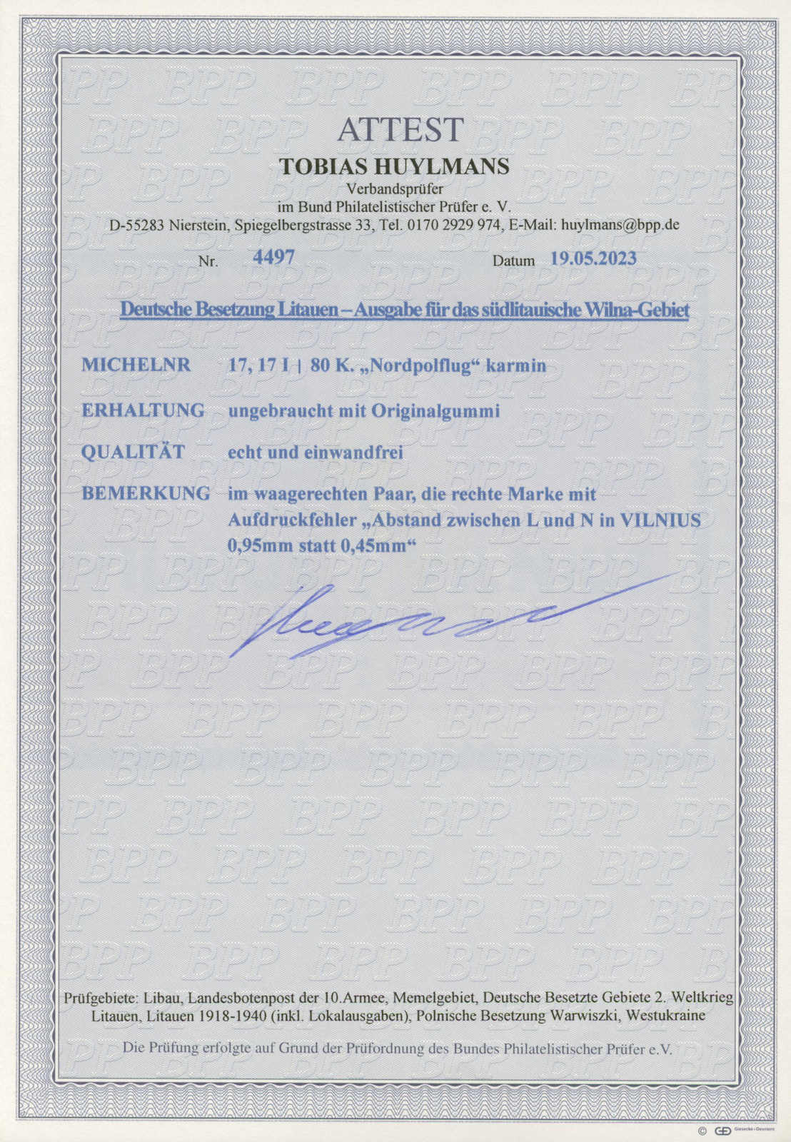 1941, 80 Kop. mit Aufdruck "VILNIUS" im waagerechten Paar, dabei die rechte Marke mit dem Aufdruckfehler "Abstand zwischen L und N 0,95 statt 0,45 mm", ungebraucht mit Originalgummierung, einwandfrei, Fotoattest Huylmans BPP 05/2023 (ME