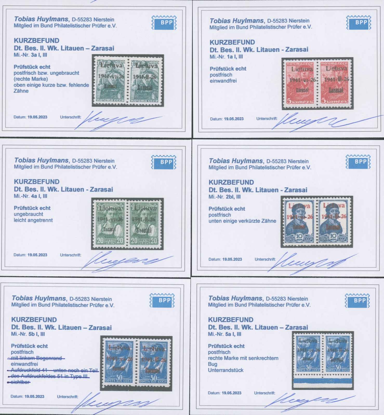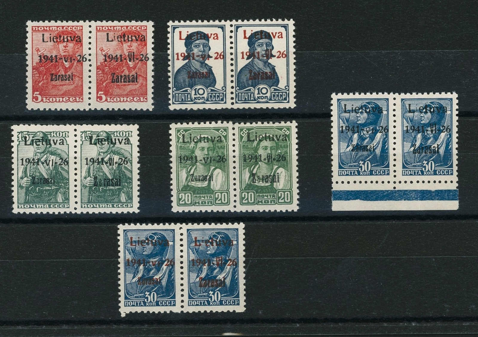 1941, Lokalausgabe Zarasai, 5 bis 30 Kop. mit Aufdruck in waagerechten Typen-Paaren, dabei 5 Kop. in Type a I und III, 10 Kop. in Type 2 bI und III, 30 Kop. In den Typen a I und III vom Unterrand sowie b I und III, postfrische
