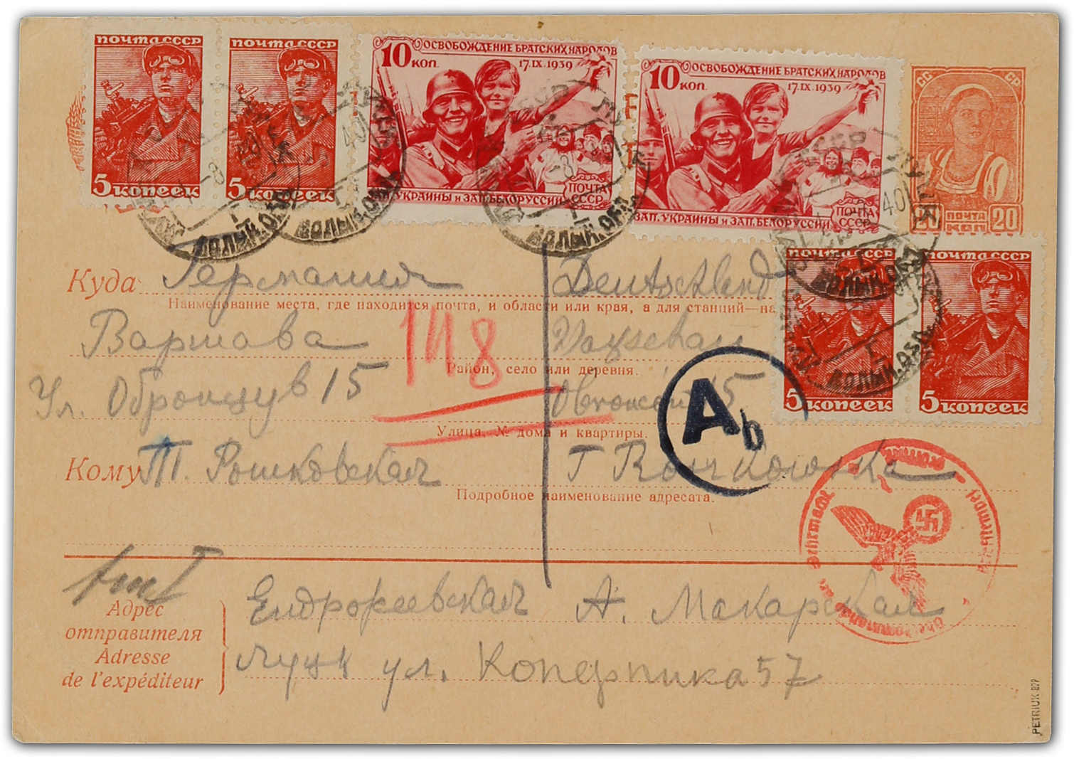 1940, sowj. GA 20 Kop. mit Zus.-Fr. 4 X 5 Kop. + 2 X 10 Kop. Befreiung Westukraine aus dem sowj. besetzten Polen nach Warschau, 1.8.1940 mit OKW-Durchlaufzensur "Ab" und Prüfstempel rot. Sign. Petriuk BPP. (Image)