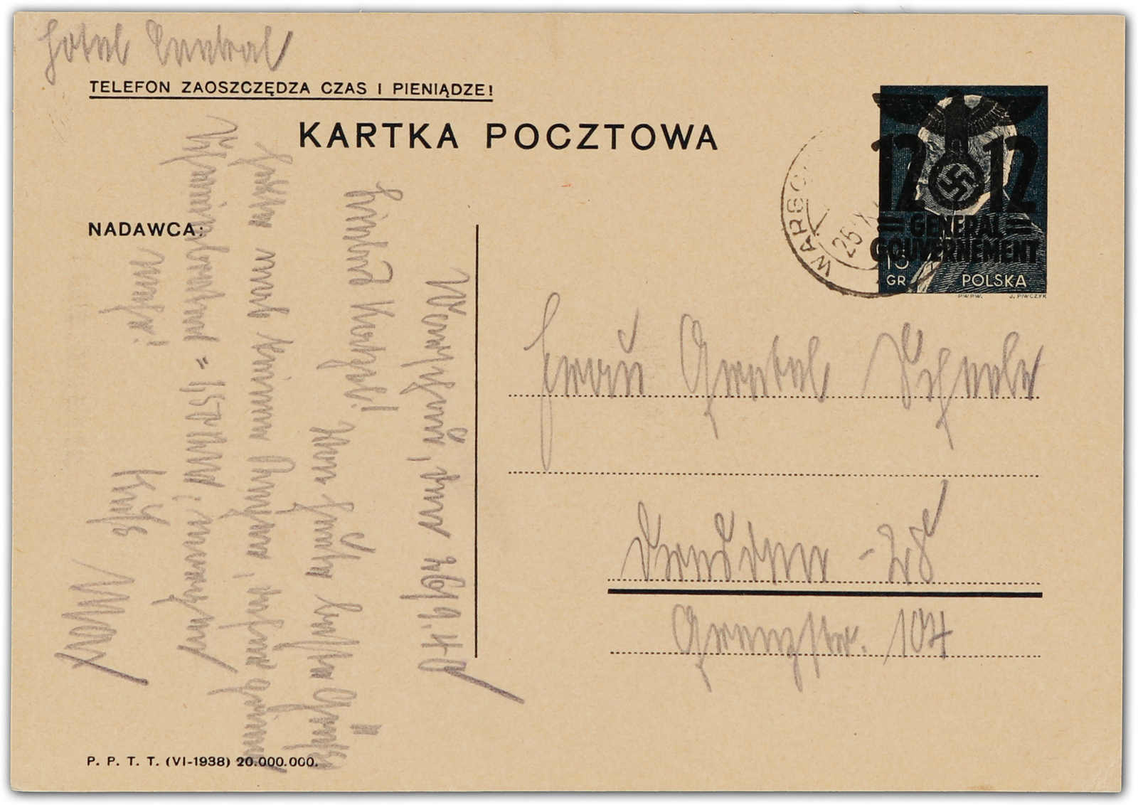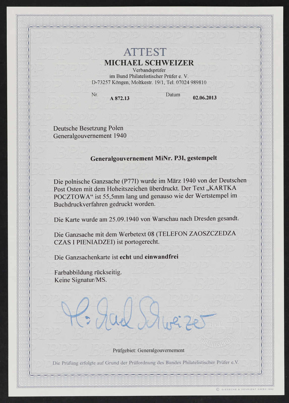 1940, poln. GA P 771 Werbetext 8 mit Überdruck, gebraucht ab Warschau 25.9.40 nach Dresden. Fotoattest Schweizer BPP (Image) (imagea)