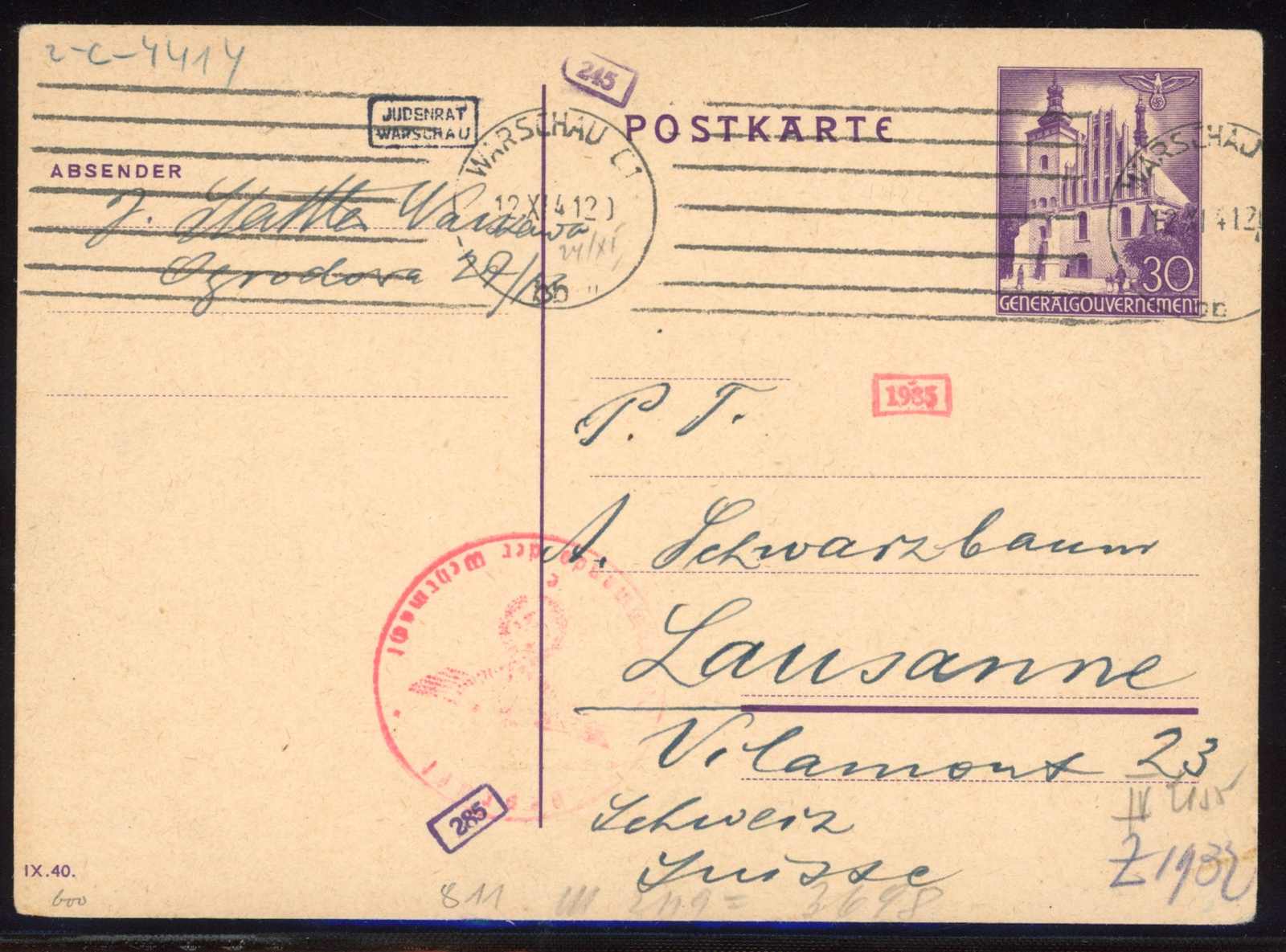 1940, 30 Gr. Ganzsachenkarte mit Wertstp. Lublin Brigittenkirche, portogerechte Verwendung als Auslandspostkarte, aufgegeben "WARSCHAU bb 12. XI. 41", im Absenderfeld Ra2 "Judenrat Warschau", adressiert nach Lausanne/Schweiz, mit