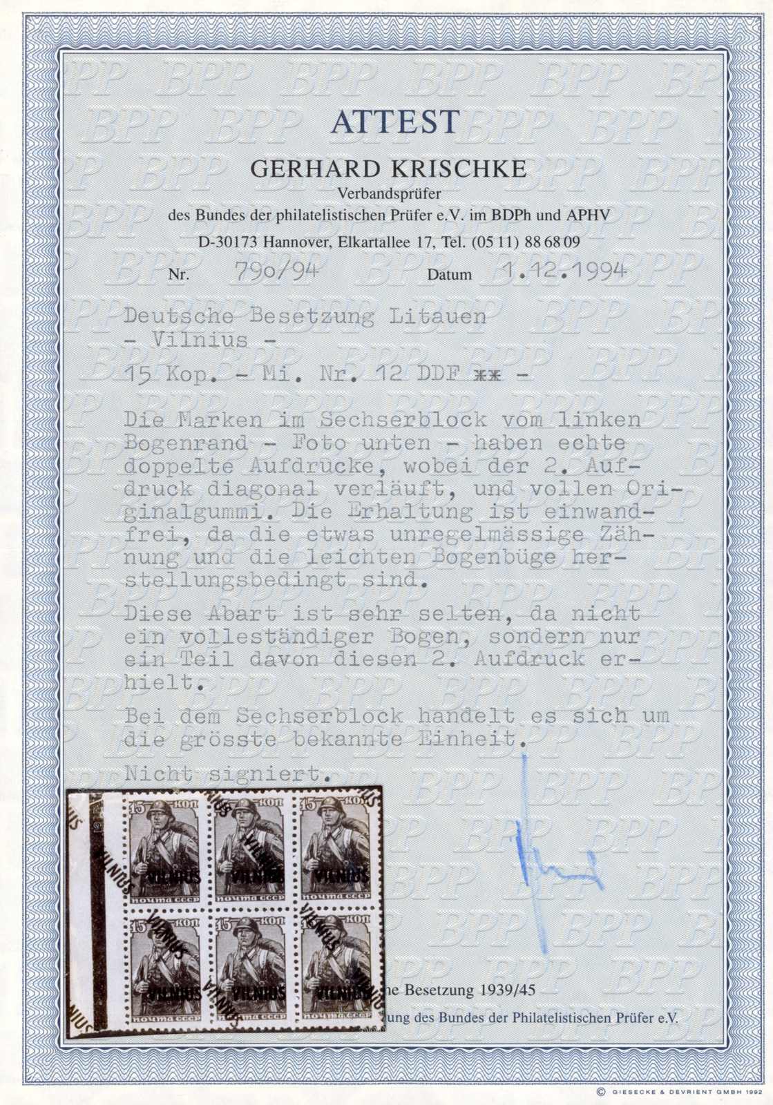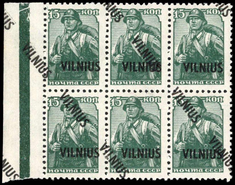 1941, 15 Kop. Werktätige mit waager. Aufdruck "VILNIUS" postfrischer Sechserblock vom linken Seitenrand mit doppeltem Aufdruck, wobei der 2. Aufdruck diagonal verläuft, einwandfreie Qualität, die etwas unregelmäßige Zähnung und die