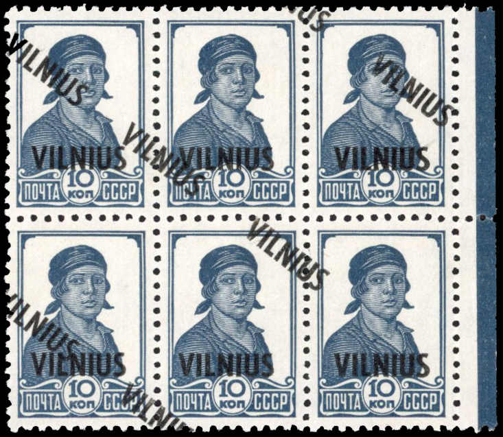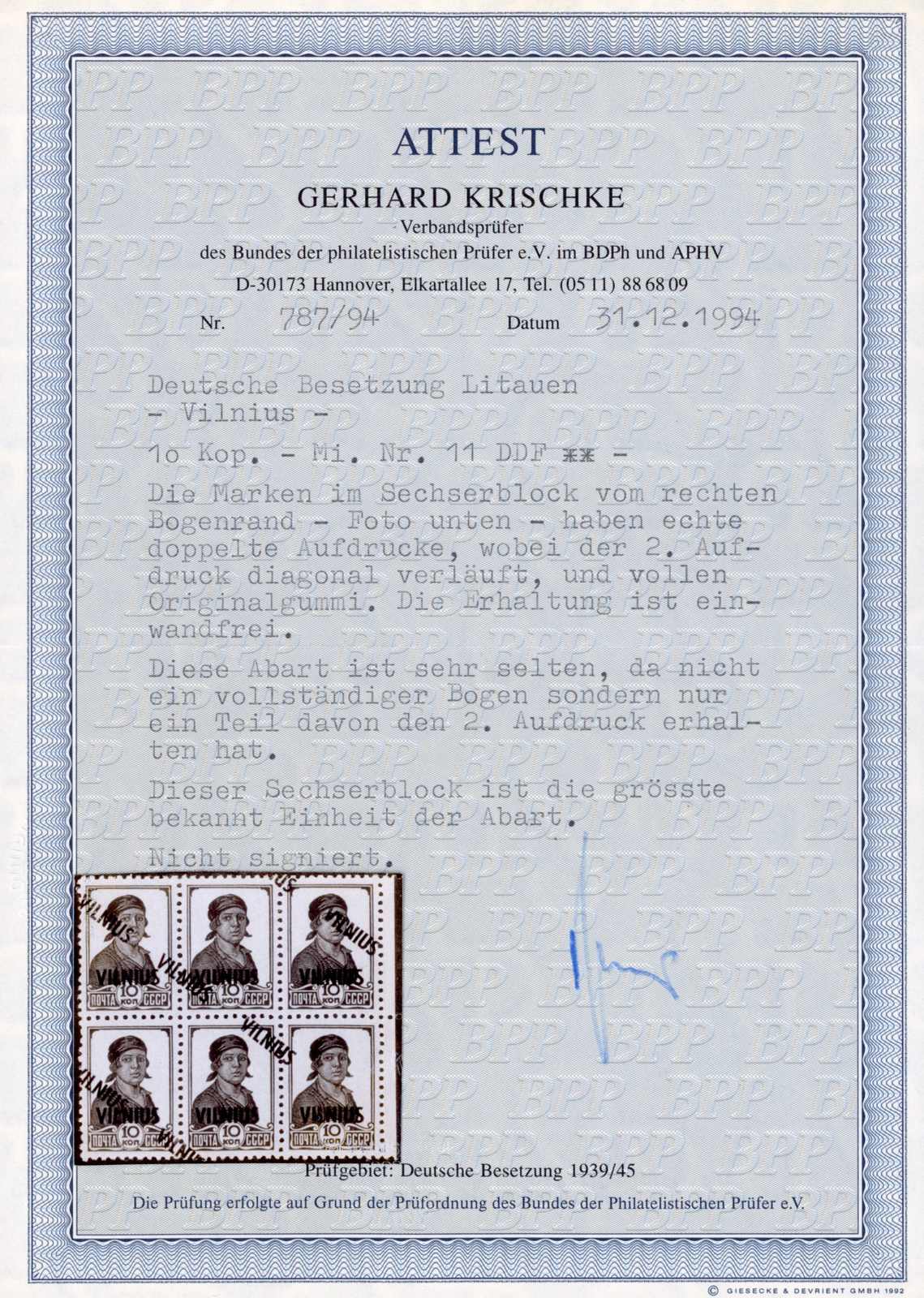 1941, 10 Kop. Werktätige mit waager. Aufdruck "VILNIUS" postfrischer Sechserblock vom rechten Seitenrand mit doppeltem Aufdruck, wobei der 2. Aufdruck diagonal verläuft, einwandfreie Qualität, Selten! Fotoattest Krischke BPP (ME