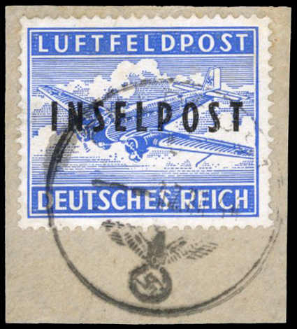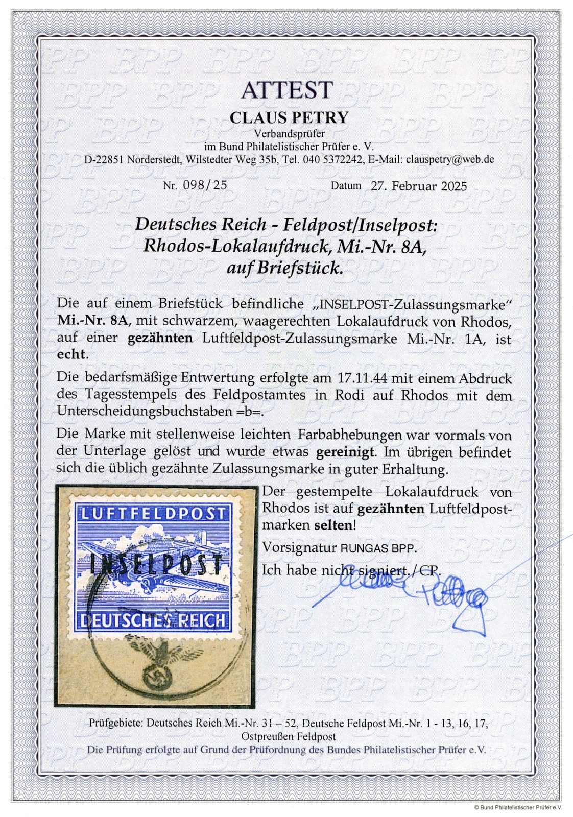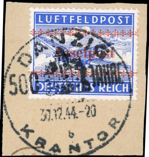 1944, Insel Rhodos, gezähnte Zulassungsmarke, bedarfsmäßig entwertet mit Tagesstempel des Felpostamtes Rodi auf Rhodos 17.11.44, Marke wurde vormals von der Unterlage gelöst und etwas gereinigt, auf Briefstück, sehr selten, signiert