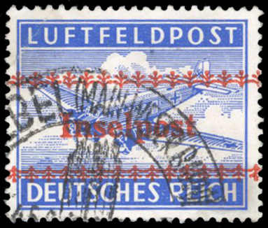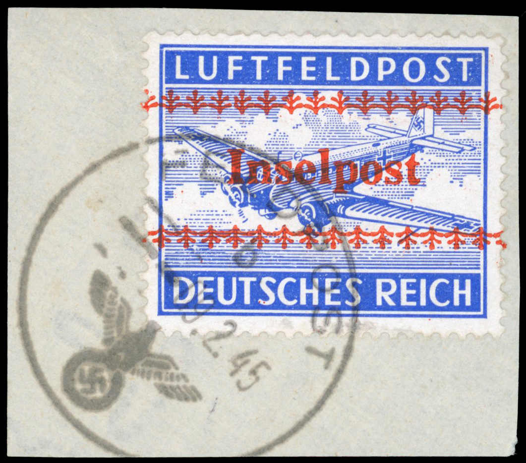 1944, Insel Kreta, gezähnte Luftfeldpost-Zusassungsmarke mit rotem Aufdruck "Inselpost" auf Briefstück mit dem Tagesstempel des Feldpostamtes Rodi auf Rhodos vom 9.2.45, farbfrische Marke, unten im Zähnungsrand Papierabschürfungen und