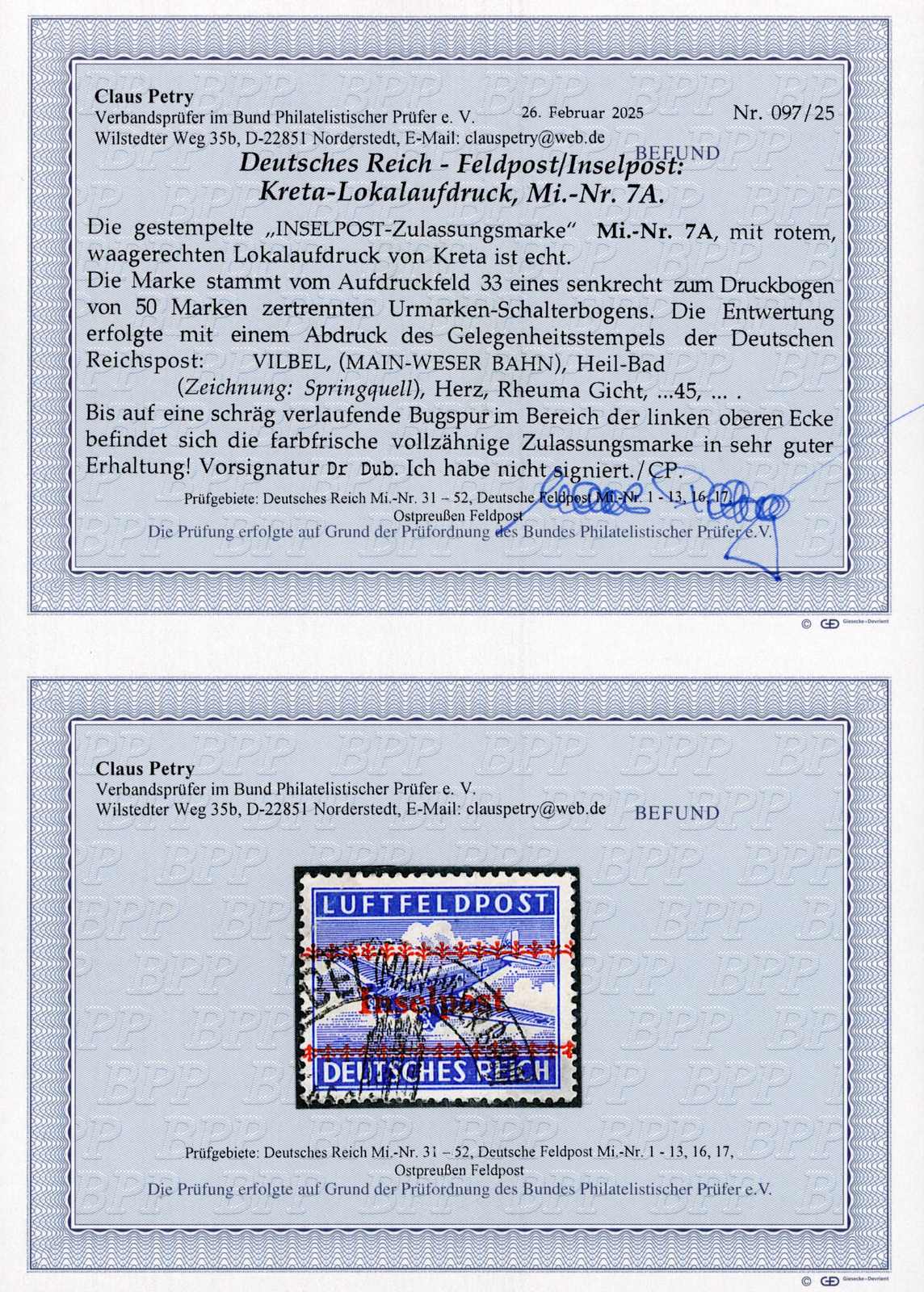 1944, Inselpost Kreta, gezähnte Zulassungsmarke mit rotem waagerechten Lokalaufdruck von Kreta, farbfrisch und gut gezähnt, entwertet mit einem Abdruck des Gelegenheitsstempels der Deutschen Reichspost: "VILBEL, (Main-Weser-Bahn) Heil-Bad