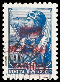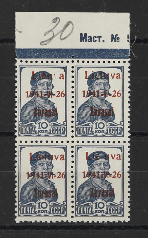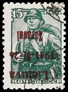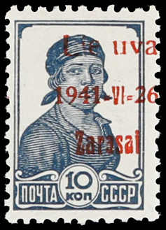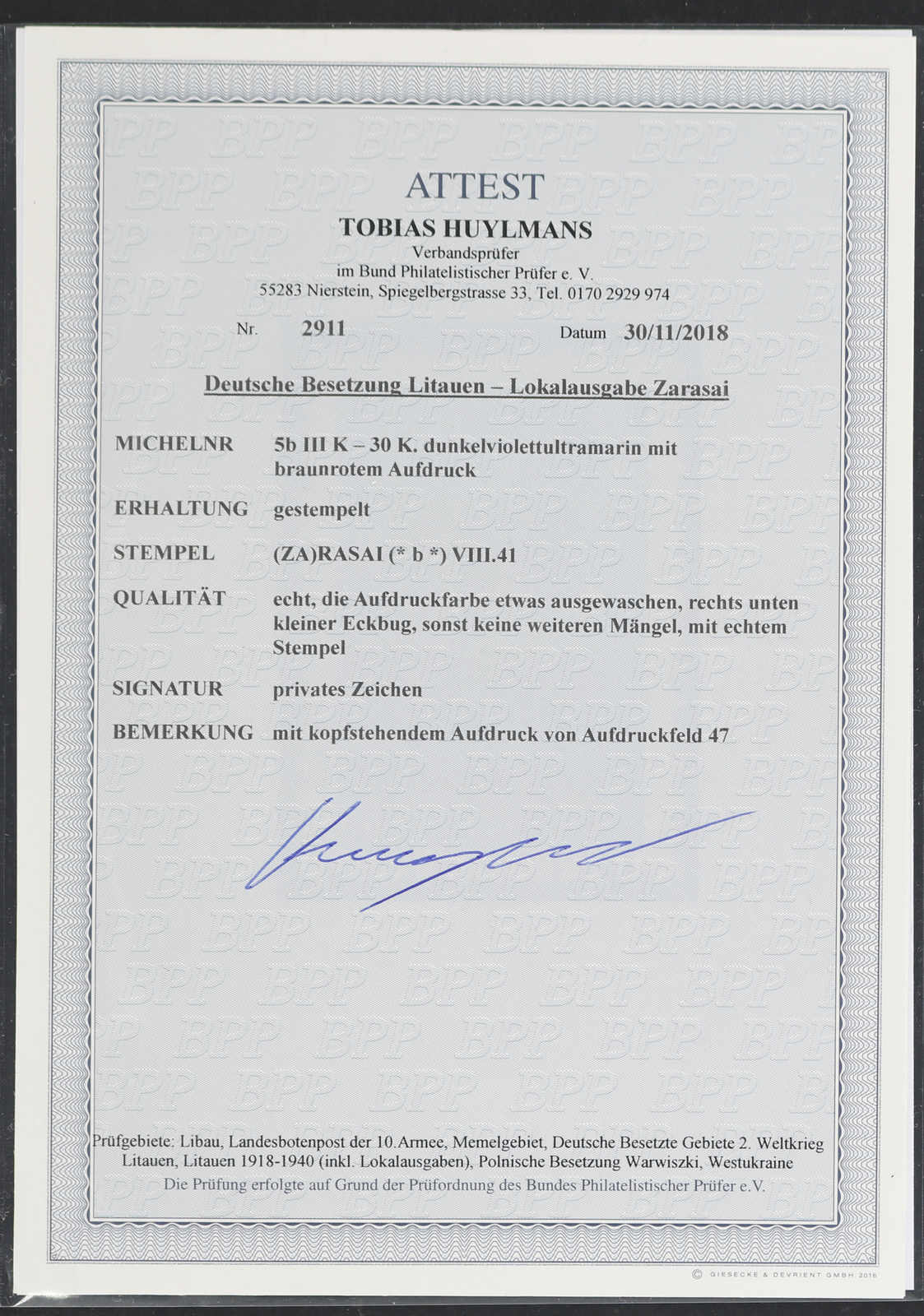 1941, 30 Kop. Werktätige, gest. Einzelwert mit dem braunroten waager. Aufdruck in der Aufdrucktype III kopfstehend, entwertet "(ZA)RASAI (*b*) VIII.41", farbfrisch und gut gezähnt, Aufdruckfarbe etwas verwaschen und rechts unten kleiner