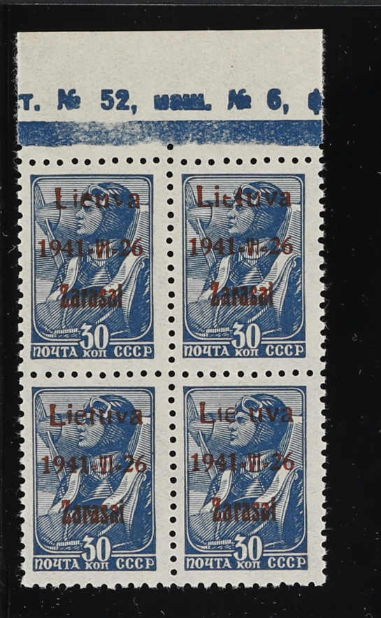 1941, 30 Kop. Werktätige, postfrischer 4er-Block vom Oberrand mit dem waager. braunroten Aufdruck in der Drucktype II B, farbfrisch und gut gezähnt, einwandfrei (ME 400,- ++) (Image)