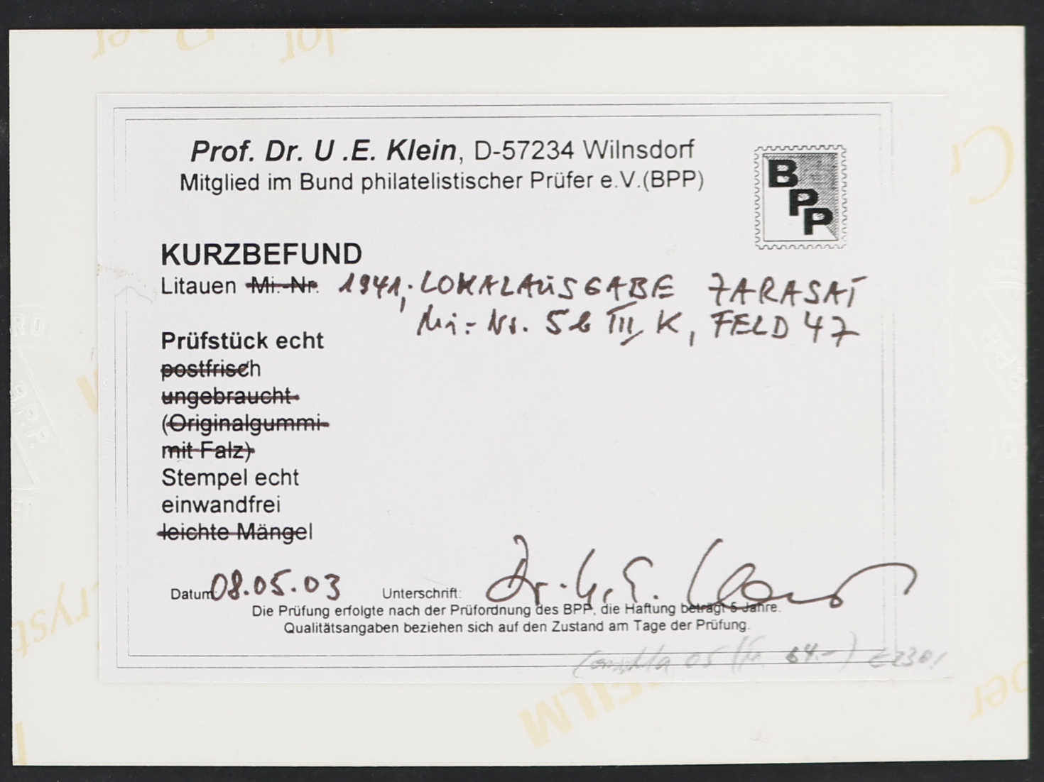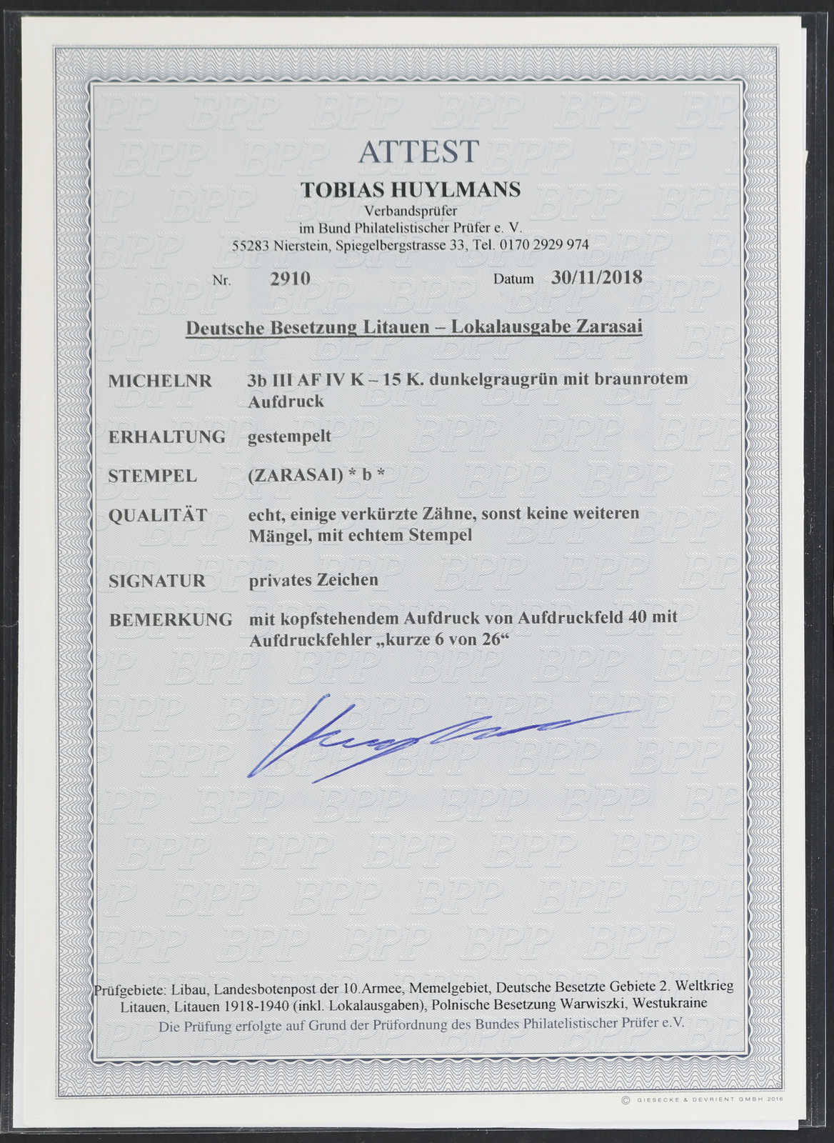 1941, 15 Kop. Werktätige, gest. Einzelwert mit dem braunroten waager. Aufdruck in der Aufdrucktype III und dem Aufdruckfehler IV "kurze 6 von 26 kopfstehend", entwertet "(ZARASAI) *b*", farbfrisch, einige verkürzte Zähne, Fotoattest