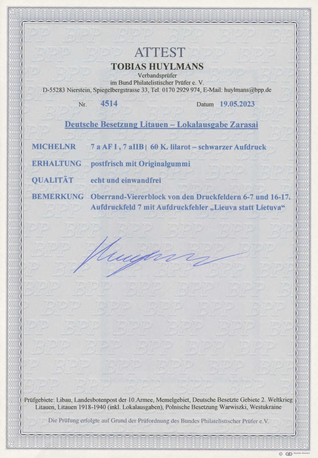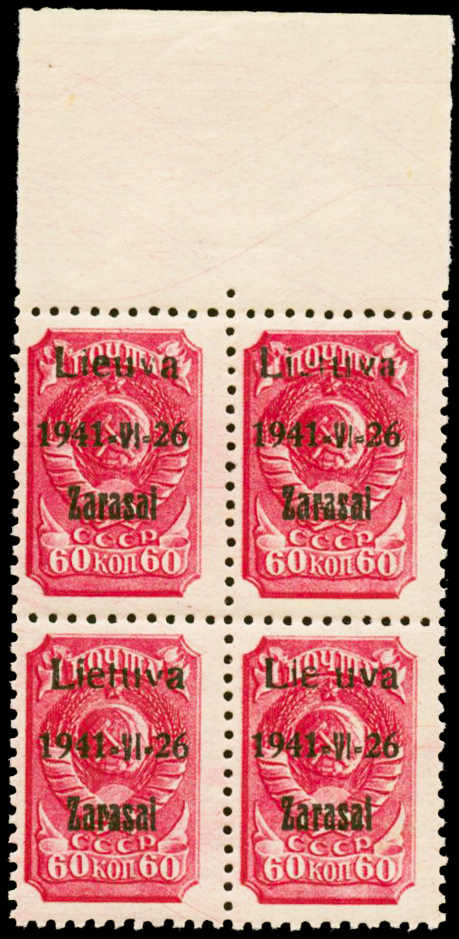 1941, Lokalausgabe Zarasai, 60 Kop. mit schwarzem Aufdruck im Viererblock vom Oberrand, dabei die rechte obere Marke mit dem Aufdruckfehler I, postfrische Originalgummierung, einwandfrei, Fotoattest Huylmans BPP 05/2023 (ME 1.620,-) (Image) (imagea)