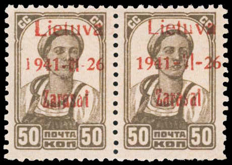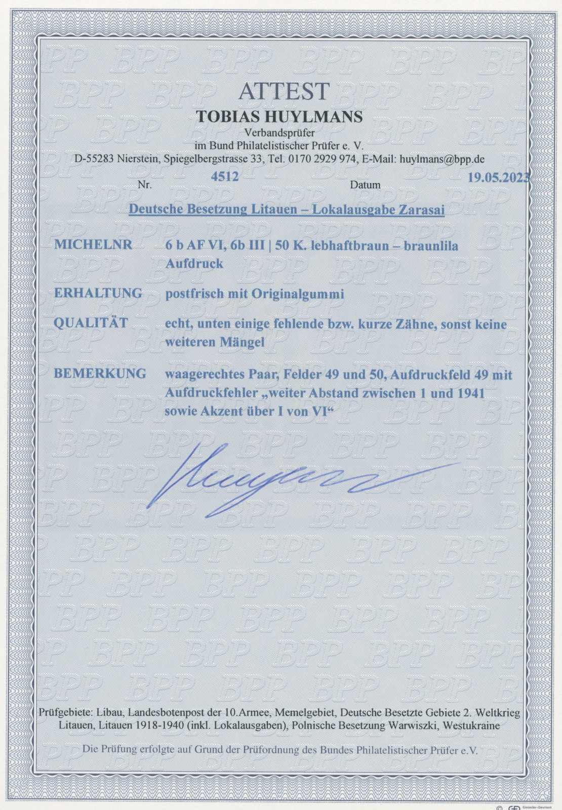 1941, Lokalausgabe Zarasai, 50 Kop. mit braunlilafarbenem Aufdruck im waagerechten Typen-Paar, dabei die linke Marke mit dem Aufdruckfehler VI, die rechte in Type III, postfrische Originalgummierung, unten einige fehlende bzw. kurze