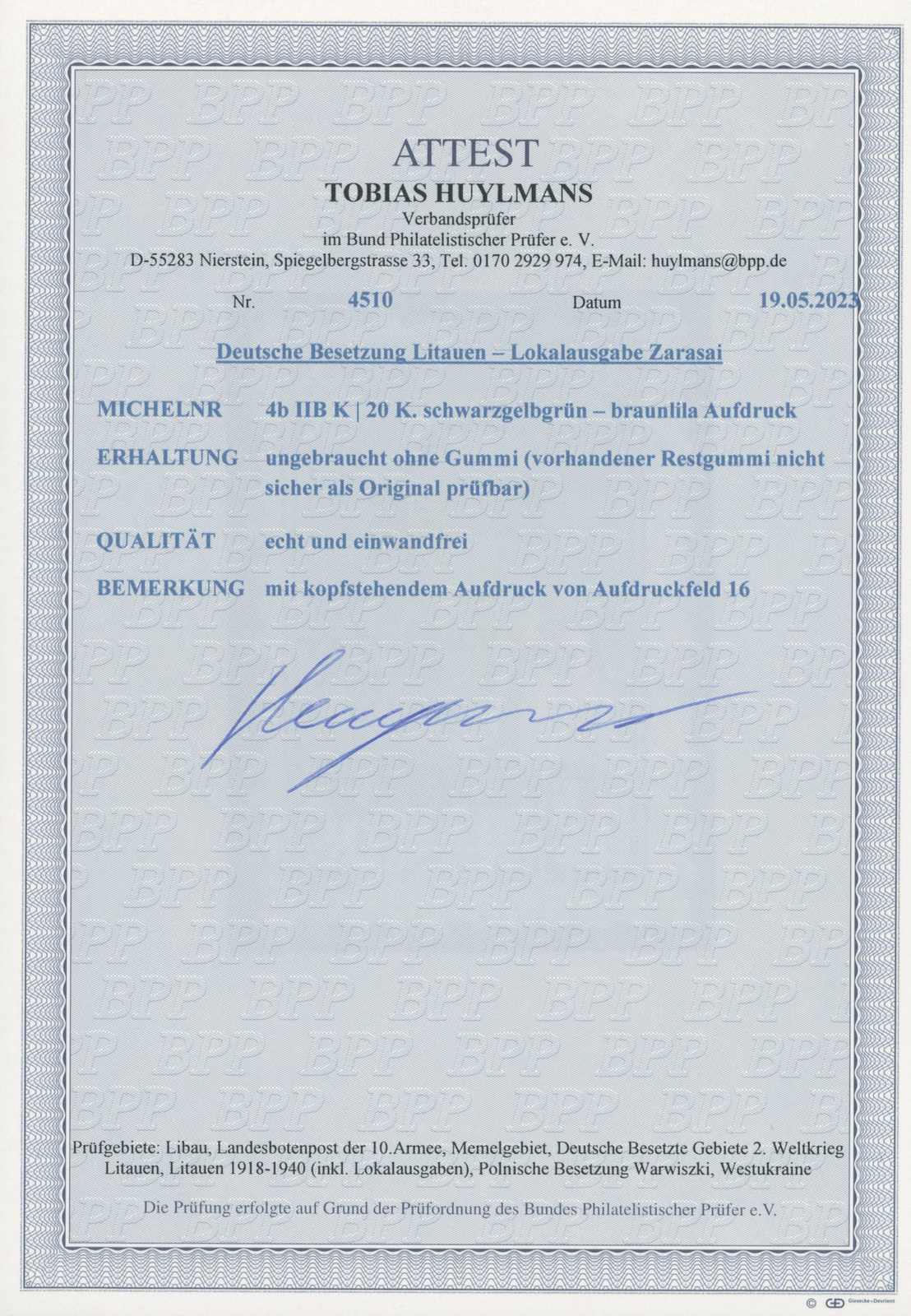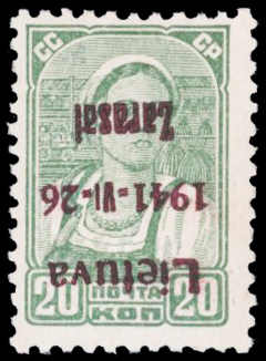 1941, Lokalausgabe Zarasai, 20 Kop. mit braunlilafarbenem Aufdruck KOPFSTEHEND, ungebraucht ohne Gummierung (vorhandener Restgummi nicht sicher als Original prüfbar), einwandfrei, Fotoattest Huylmans BPP 05/2023 (ME 700,- für
