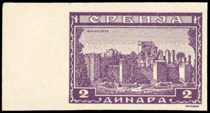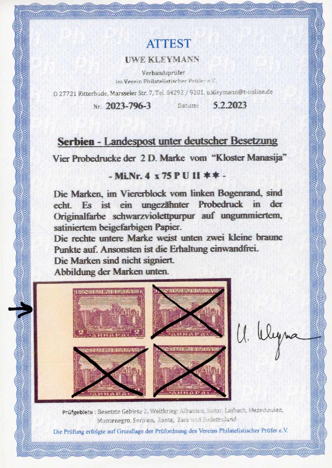 1942, 2 D. Kloster Manaija violettpurpur als ungezähnter Probedruck auf ungummiertem satinierten beigefarbenen Papier vom linken Seitenrand, einwandfrei, unsigniert, Fotoattestkopie Kleymann für ehemaligen Viererblock 02/2023 (ME -.-) (Image) (imagea)