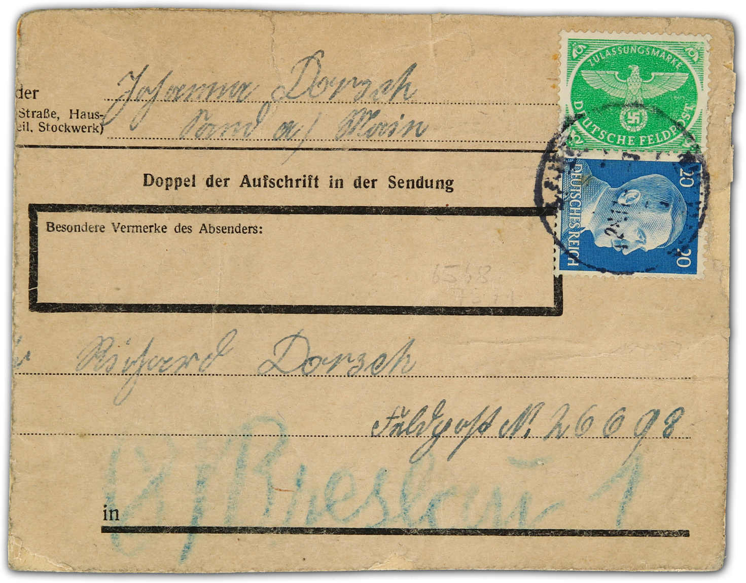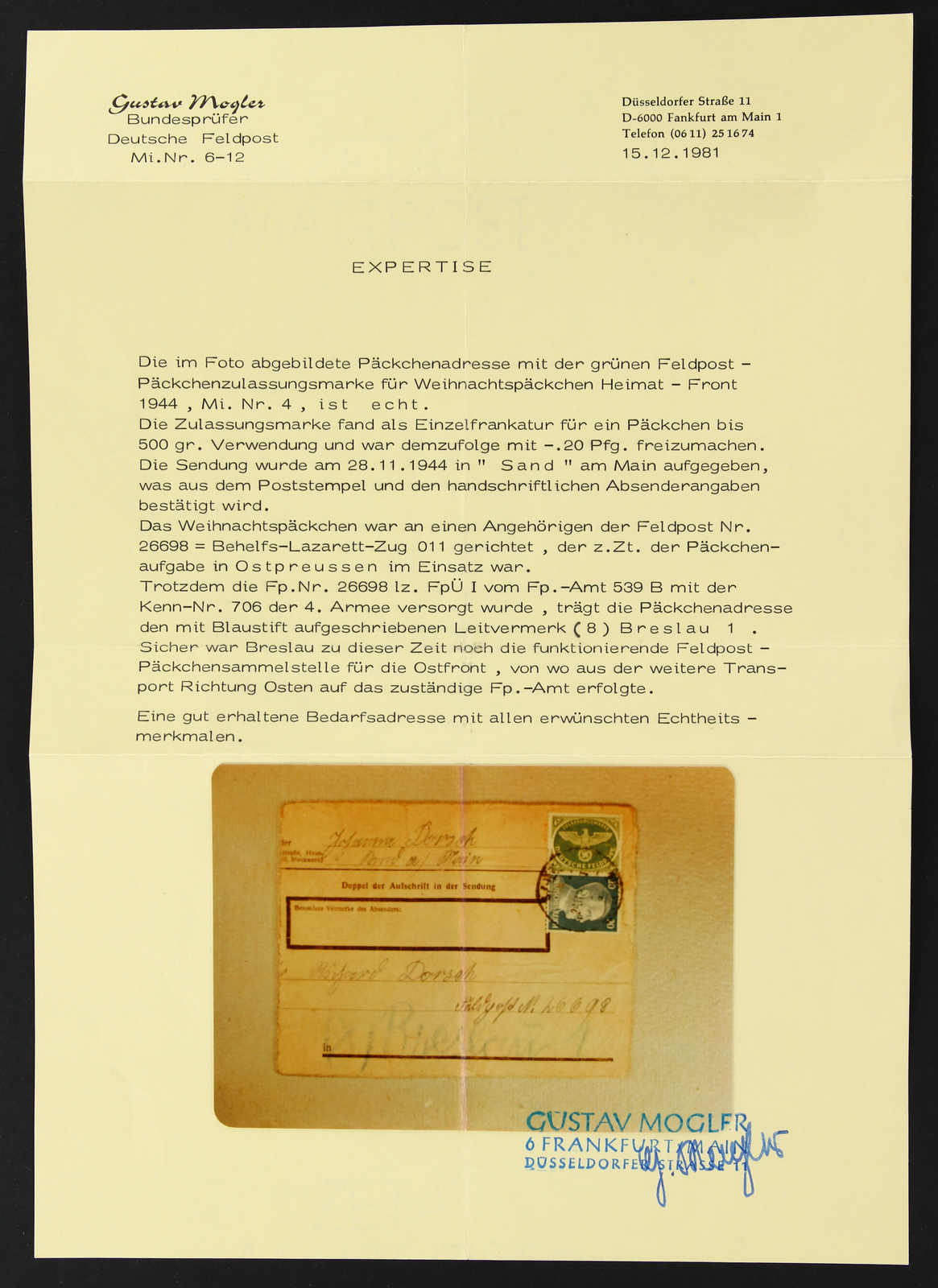 1944, Zulassungsmarke für Weihnachtspäckchen bis 1 kg Richtung Heimat-Front,(dunkel)smaragdgrün mit Zusatzfr. 20 Pfg. (Mi-Nr. 791) auf kpl. Päckchenadresse, aufgegeben in Sand a. Main, entwertet mit Tagesstp. vom 28.11.1944, adressiert