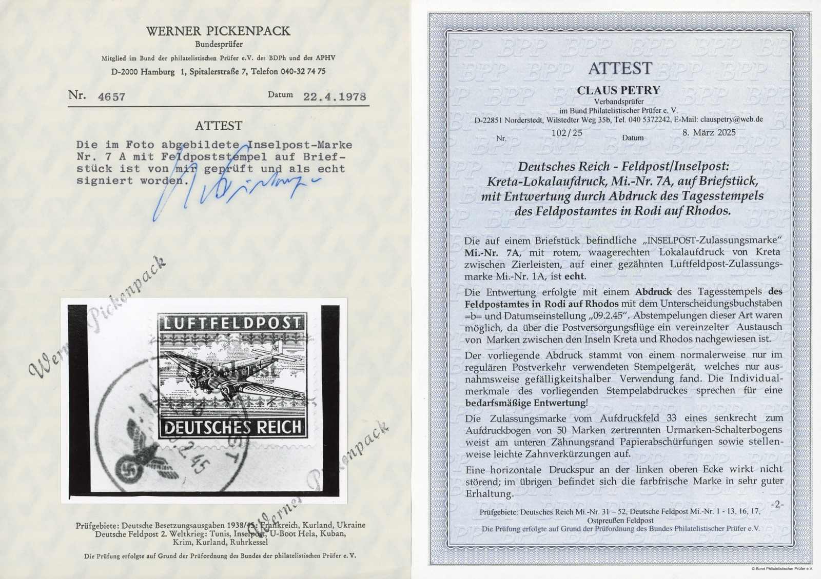 Feldpostamtes Rhodos mit Unterscheidungsbuchstaben =b= gehören auf Kreta-Lokalaufdrucken zu den ausgefallenen und seltensten Erscheinungsformen im Bereich der Abstempelungen von Inselpost-Zulassungsmarken!" (Image) (imagea)
