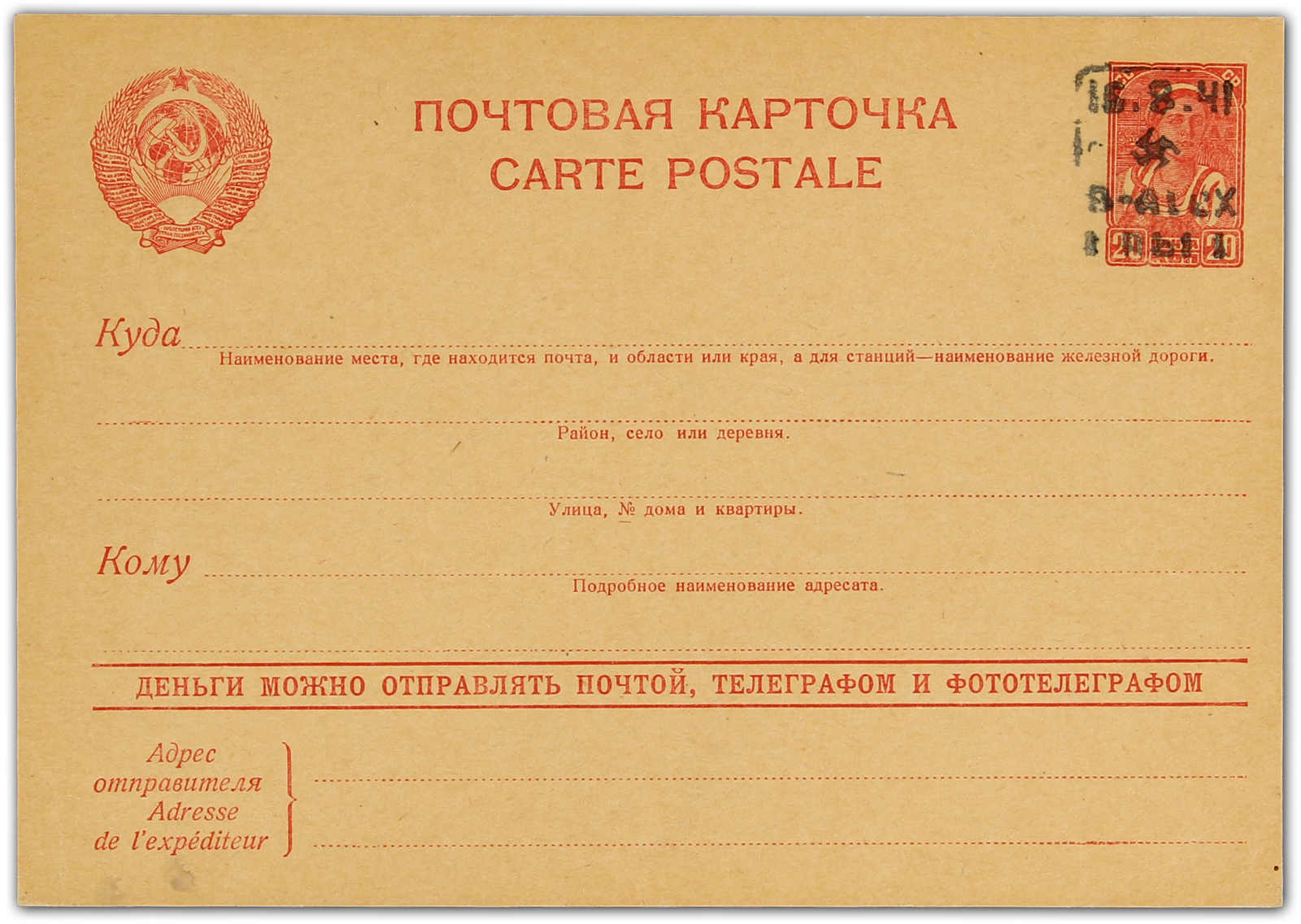 1941, 20 Kop. Ganzsachen-Postkarte der SU mit schwarzem Aufdruck 1 Rbl. von Alexanderstadt, ungebr., einwandfrei, mehrfach sign., u.a. Zirath BPP (ME 1.000,-) (Image)