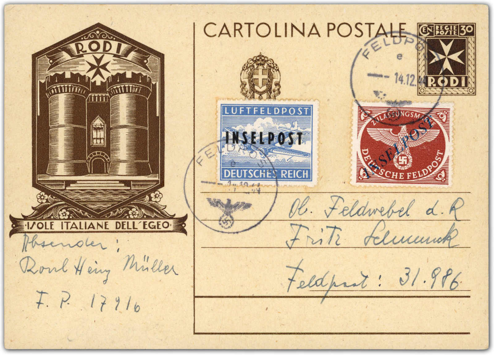 1944, Zulassungsmarke der Insel Rhodos lebhaftgrauultramarin durchstochen und die 2. Inselpost-Ausgabe dunkelbräunlichrot mit "Agramer-Aufdruck" durchstochen, beide Werte auf ital. Postkarte als Sammlersendung, aufgegeben bei "FELDPOST