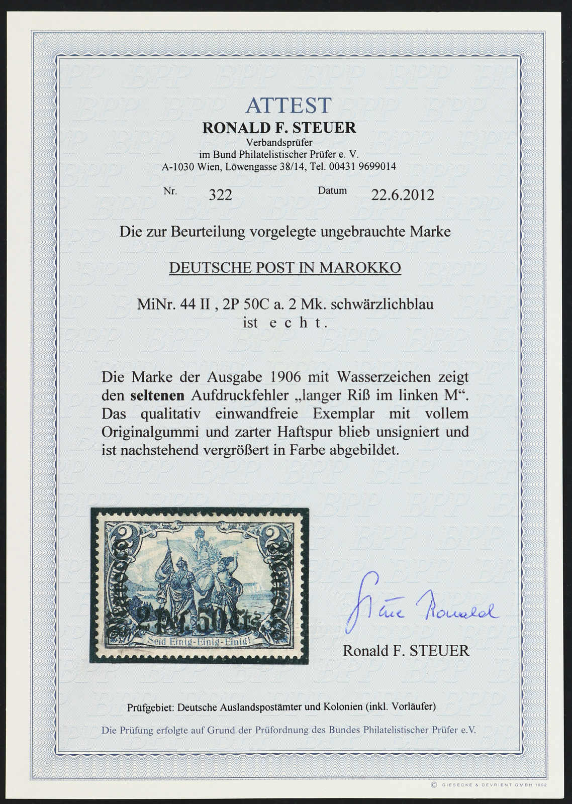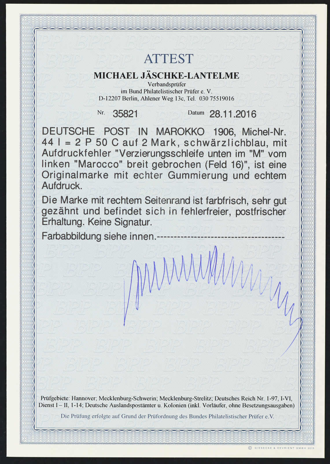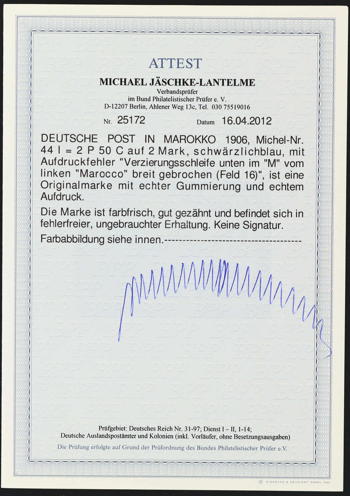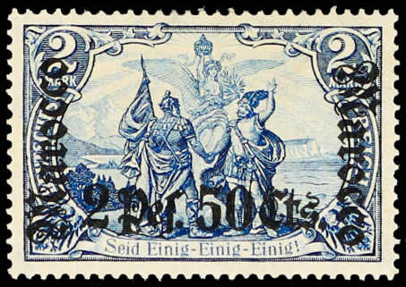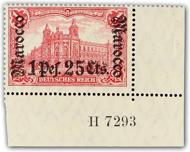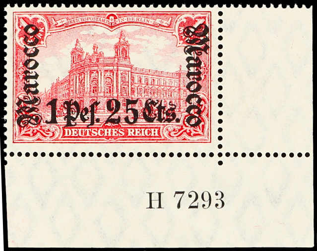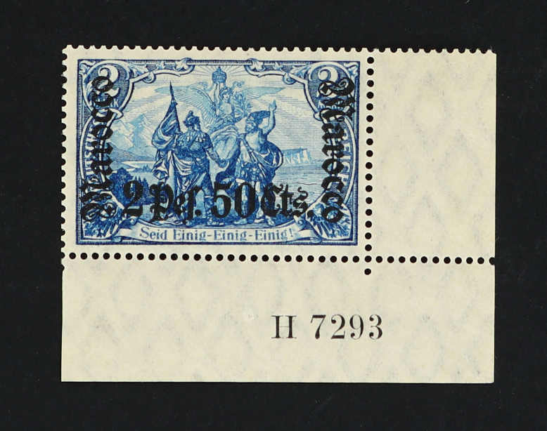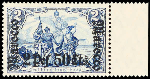 633 nh Michel:44I image1906, 2 P. 50 C. auf 2 M. Aufdruckausgabe schwärzlichblau mit Aufdruckfehler "Verzierungsschleife unten im M vom linken Marocco gebrochen", postfrisches Exemplar vom rechten Bogenrand, einwandfrei, unsigniert, Fotoattest Jäschke-Lantelme BPP (ME 1.600,-) (Image) (imagea)