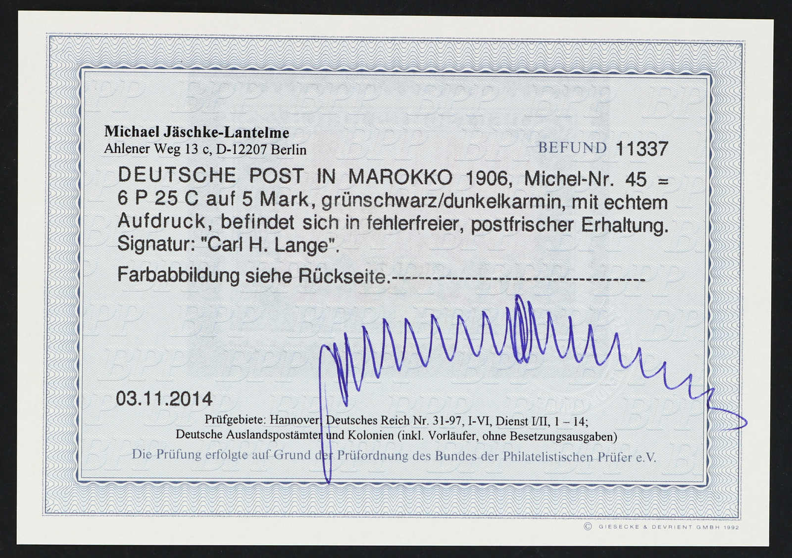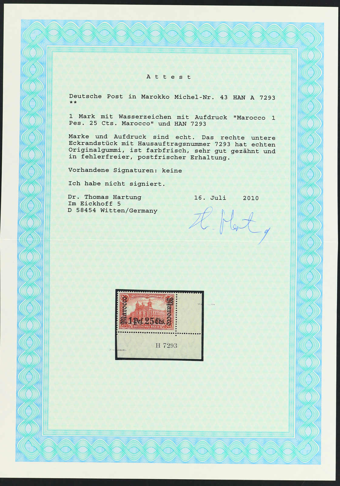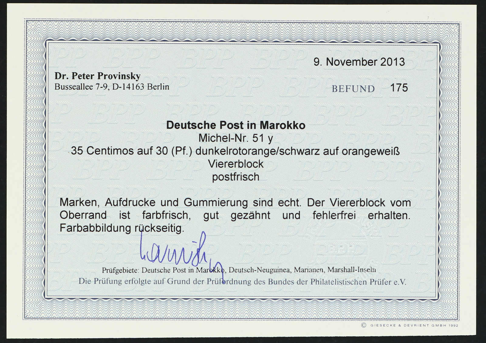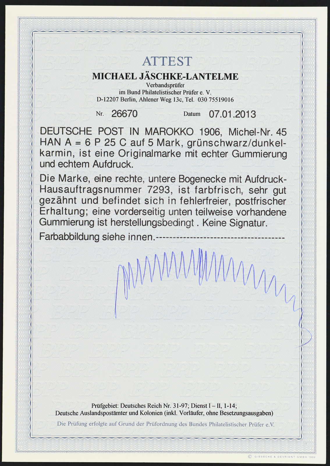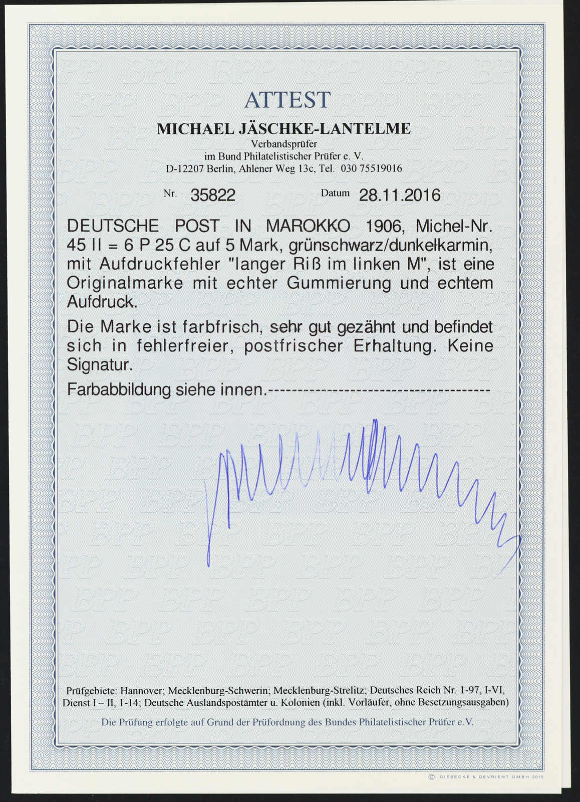633 nh Michel:44I image1906, 2 P. 50 C. auf 2 M. Aufdruckausgabe schwärzlichblau mit Aufdruckfehler "Verzierungsschleife unten im M vom linken Marocco gebrochen", postfrisches Exemplar vom rechten Bogenrand, einwandfrei, unsigniert, Fotoattest Jäschke-Lantelme BPP (ME 1.600,-) (Image) (imagea)