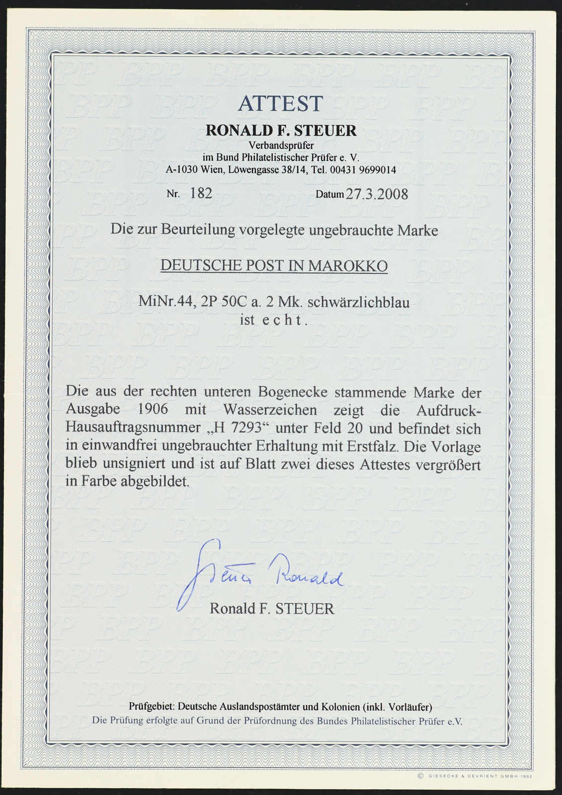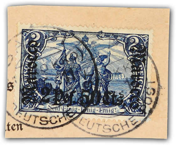 632 Briefst. Michel:44 image1906, 2 P. 50 C. auf 2 M. schwärzlichblau, auf kl. PA-Ausschnitt, entwertet "SAFFI MAROKKO DEUTSCHE POST ... 6. 11", farbfrisch und gut gezähnt, einwandfrei, sign. Bothe BPP, einwandfrei (ME 440,-) (Image)