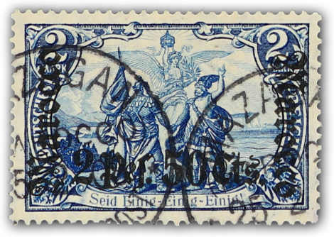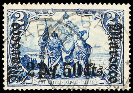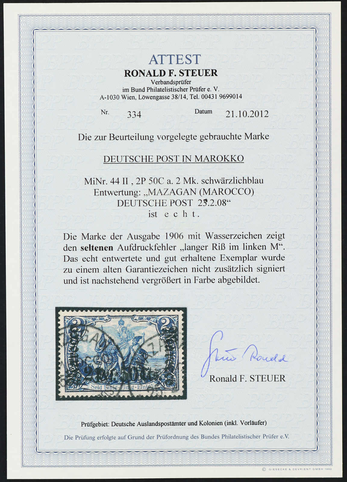 637 gest. Michel:44II image1906, 2 P. 50 C. auf 2 M. Aufdruckausgabe schwärzlichblau mit Aufdruckfehler "langer Riss im linken M", sauber gestempelt "MAZAGAN (MAROCCO) DEUTSCHE POST 25.02.08", einwandfrei, signiert, Fotoattest Steuer BPP (ME nicht notiert) (Image) (imagea)