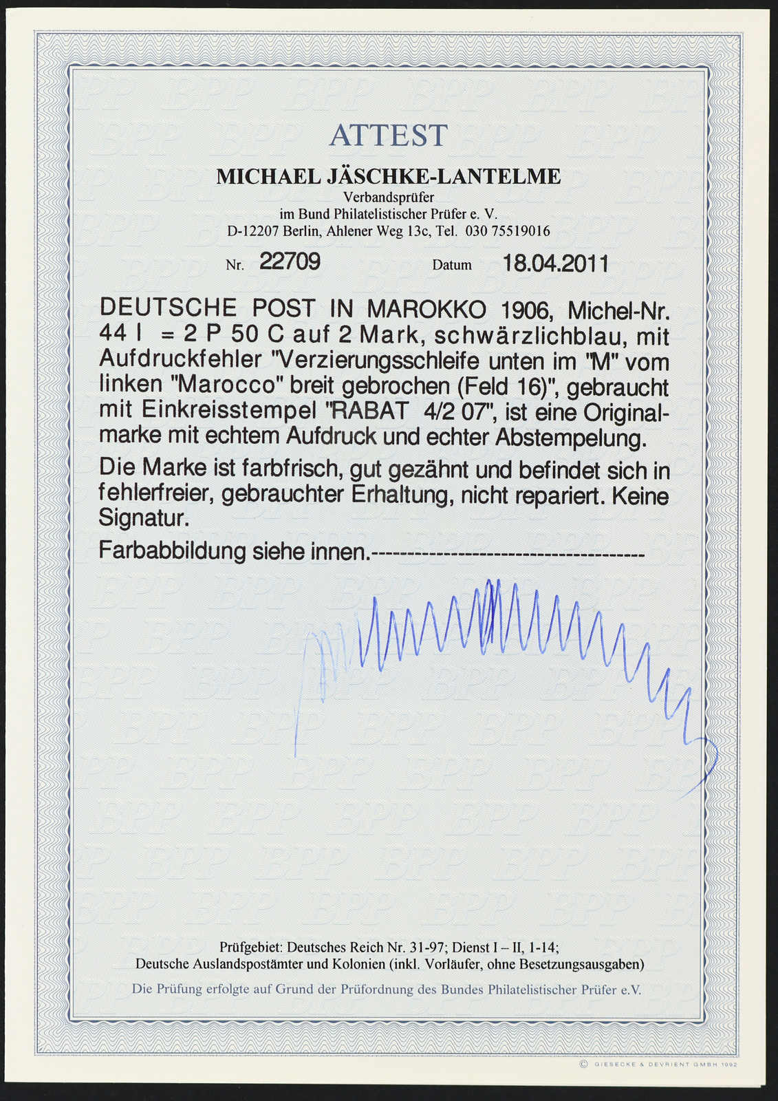 635 gest. Michel:44I image1906, 2 P. 50 C. auf 2 M. Aufdruckausgabe schwärzlichblau mit Aufdruckfehler "Verzierungsschleife unten im M vom linken Marocco breit gebrochen", farbfrisch, sauber gestempelt "RABAT 4/2 07", farbfrisch, einwandfrei, Fotoattest Jäschke-Lantelme BPP (ME 1.600,-) (Image) (imagea)