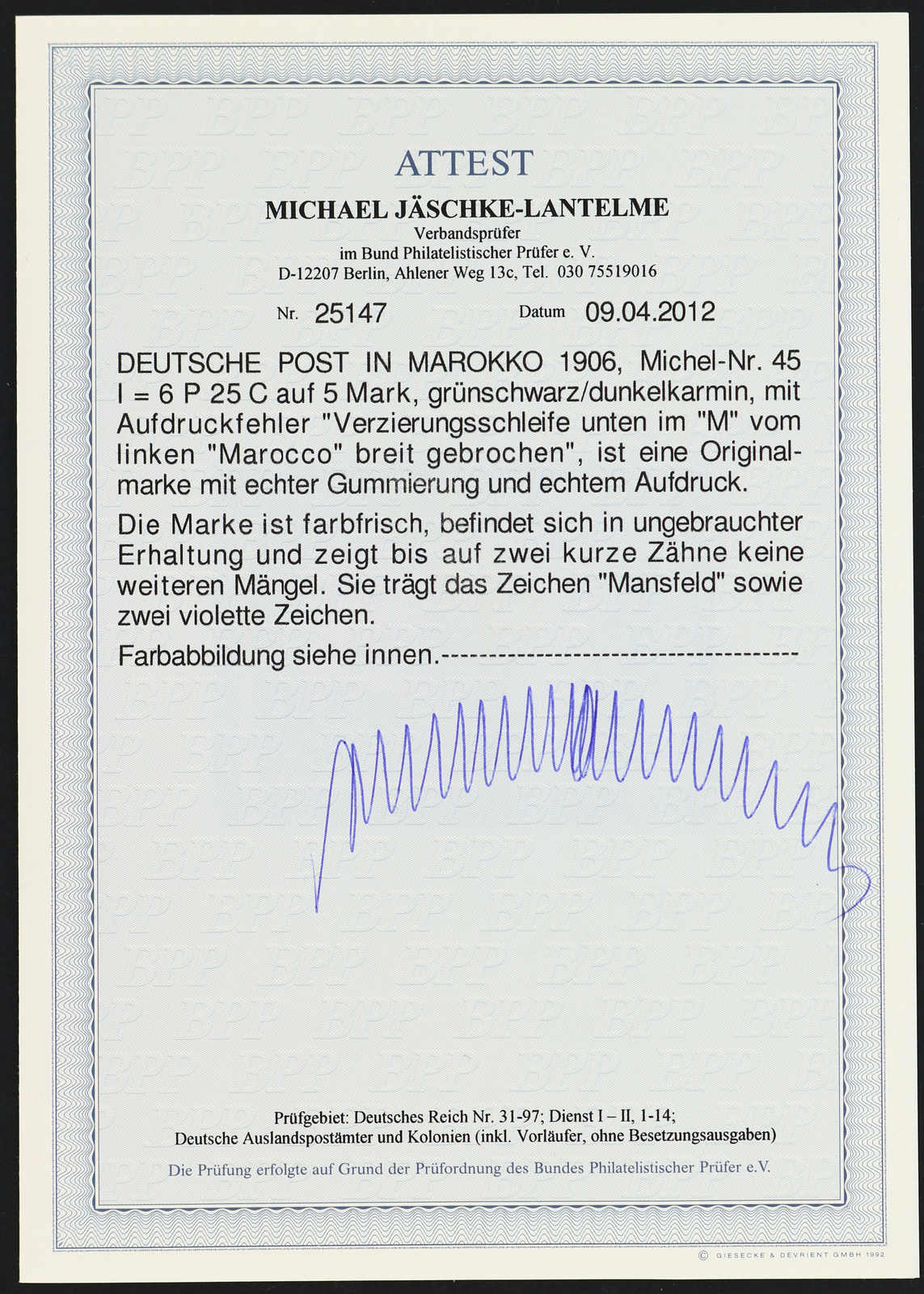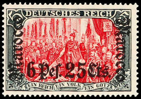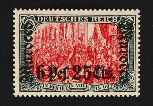 642 og Michel:45I image1906, 6 P. 25 C. auf 5 M. Aufdruckausgabe grünschwarz/dunkelkarmin, mit Aufdruckfehler "Verzierungsschleife unten im M vom linken Marocco breit gebrochen", farbfrisch, ungebraucht, zwei kurze Zähne, signiert Mansfeld, Fotoattest Jäschke-Lantelme BPP (ME -,-) (Image) (imagea)