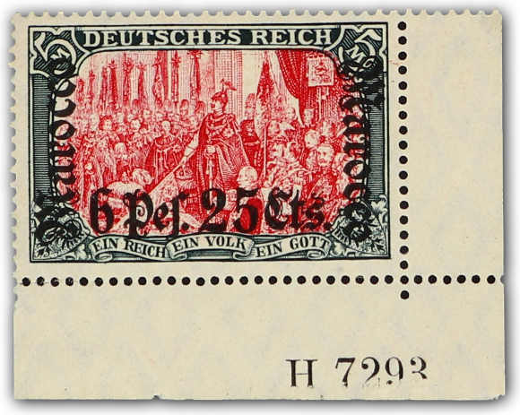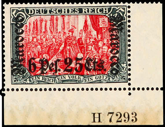 646 nh Michel:45HANA image1906, 6 P. 25 C. auf 5 M. Aufdruckausgabe grünschwarz/dunkelkarmin, postfrisiches Exemplar aus der unteren rechten Bogenecke mit Aufdruck-HAN 7293, farbfrisch und einwandfrei, eine vorderseitig unten teilweise vorhandene Gummierung ist herstellungsbedingt, unsigniert, Fotoattest Jäschke-Lantelme BPP (ME 1.700,-) (Image) (imagea) (imageb)