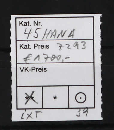 647 og Michel:45HANA image1906, 6 P. 25 C. auf 5 M. grünschwarz/dunkelkarmin, ungebrauchter Einzelwert aus der unteren rechten Bogenecke mit der HAN H 7293, farbfrisch und gut gezähnt, waagerechte Perforation links angetrennt, sonst einwandfrei (ME 700,-) (Image)
