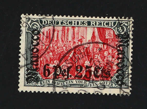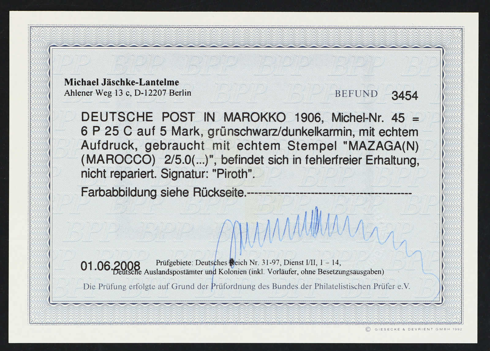 640 gest. Michel:45 image1906, 6 P. 25 C. auf 5 M. Aufdruckausgabe grünschwarz/dunkelkarmin, gestempelt "MAZAGA(N) (MAROCCO) 2/5.0(.)", einwandfrei, signiert Piroth, Fotobefund Jäschke-Lantelme BPP (ME 400,-) (Image) (imagea)