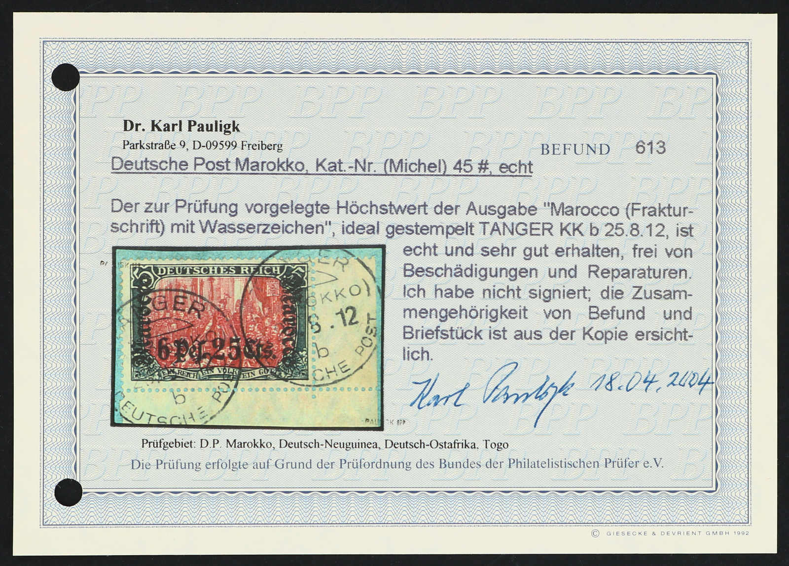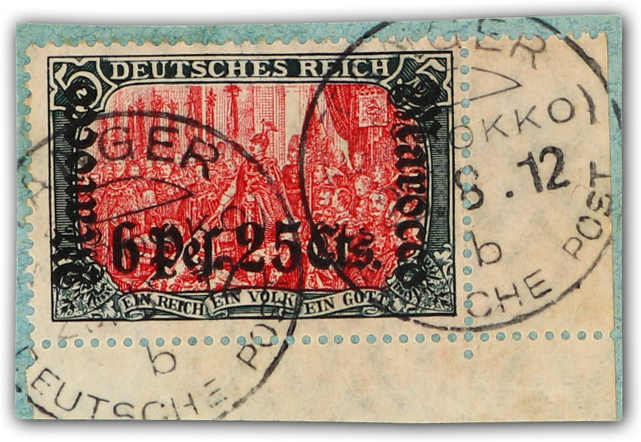 641 Briefst. Michel:45 image1906, 6 P. 25 C. auf 5 M. Aufdruckausgabe grünschwarz/dunkelkarmin aus der unteren rechten Bogenecke, glasklar gestempelt "TANGER (MAROKKO) DEUTSCHE POST b 25.8.12" auf Briefstück, einwandfrei, Fotobefund Pauligk BPP (ME 800,-) (Image) (imagea)