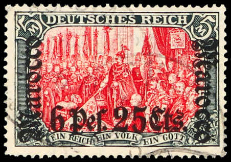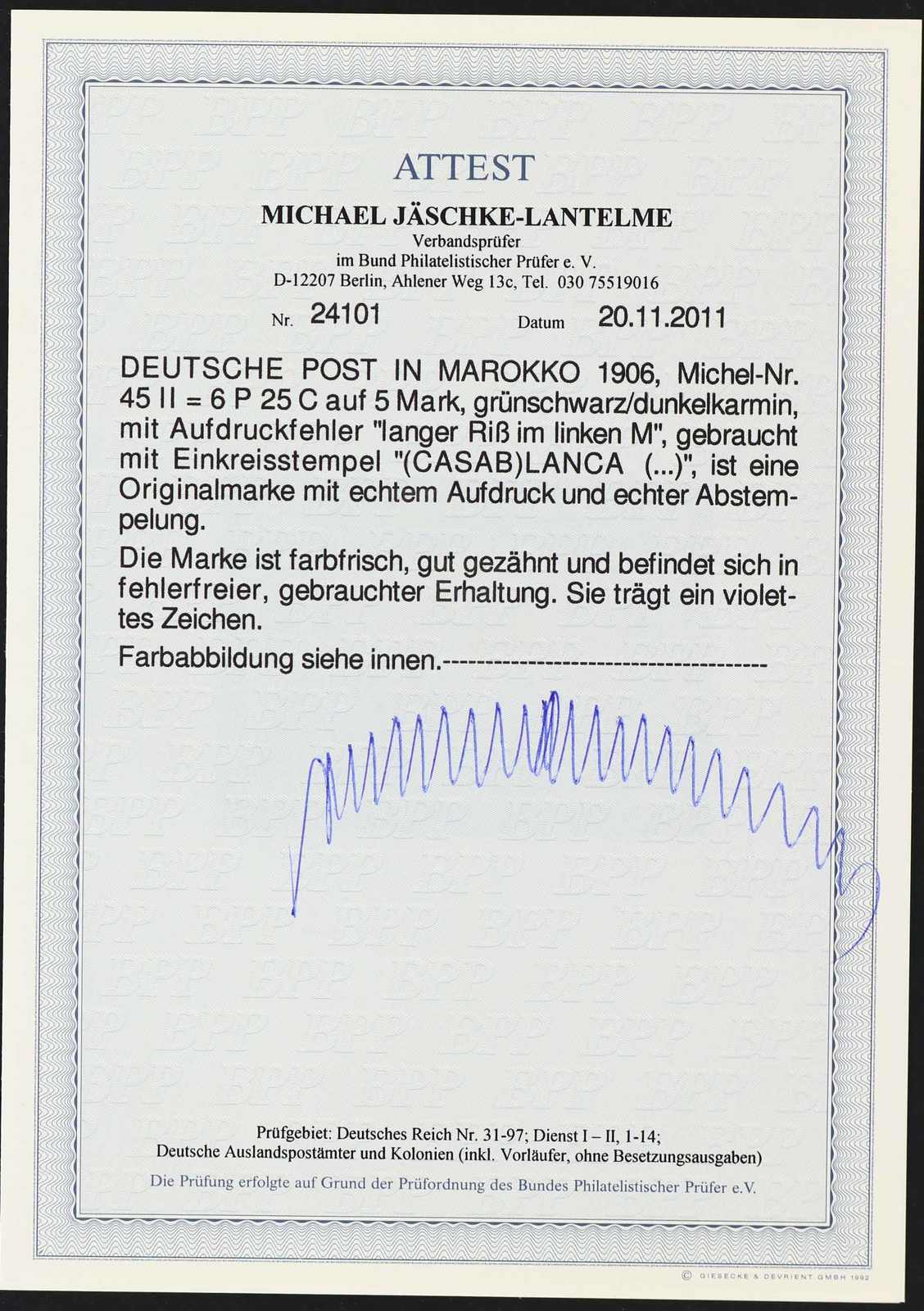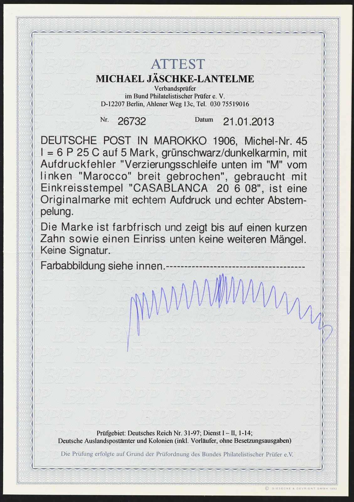 643 gest. Michel:45I image1906, 6 P. 25 C. auf 5 M. Aufdruckausgabe grünschwarz/dunkelkarmin, mit Aufdruckfehler "Verzierungsschleife unten im M vom linken Marocco breit gebrochen", gestempelt "CASABLANCA 20 6 08", farbfrisch, ein kurzer Zahn und Einriss, Fotoattest Jäschke-Lantelme BPP (ME -,-) (Image) (imagea)