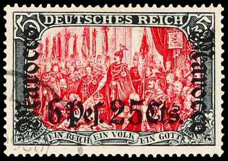 645 gest. Michel:45II image1906, 6 P. 25 C. auf 5 M. Aufdruckausgabe grünschwarz/dunkelkarmin, mit Aufdruckfehler "langer Riss im linken M", gestempelt "(CASAB)LANCA", farbfrisch, einwandfrei, signiert, Fotoattest Jäschke-Lantelme BPP (ME -,-) (Image) (imagea)