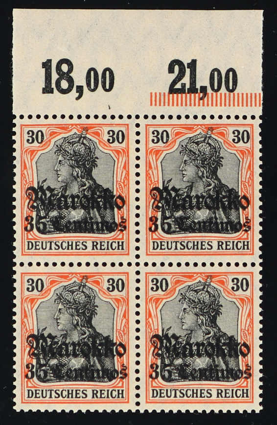 648 nh Michel:51y(4) image1913, 35 C. auf 30 Pfg. Aufdruckausgabe dunkelrotorange/schwarz auf orangeweiß, postfrischer Viererblock vom Oberrand, einwandfrei, Fotobefund Dr. Provinsky BPP (ME 360,-) (Image) (imagea)