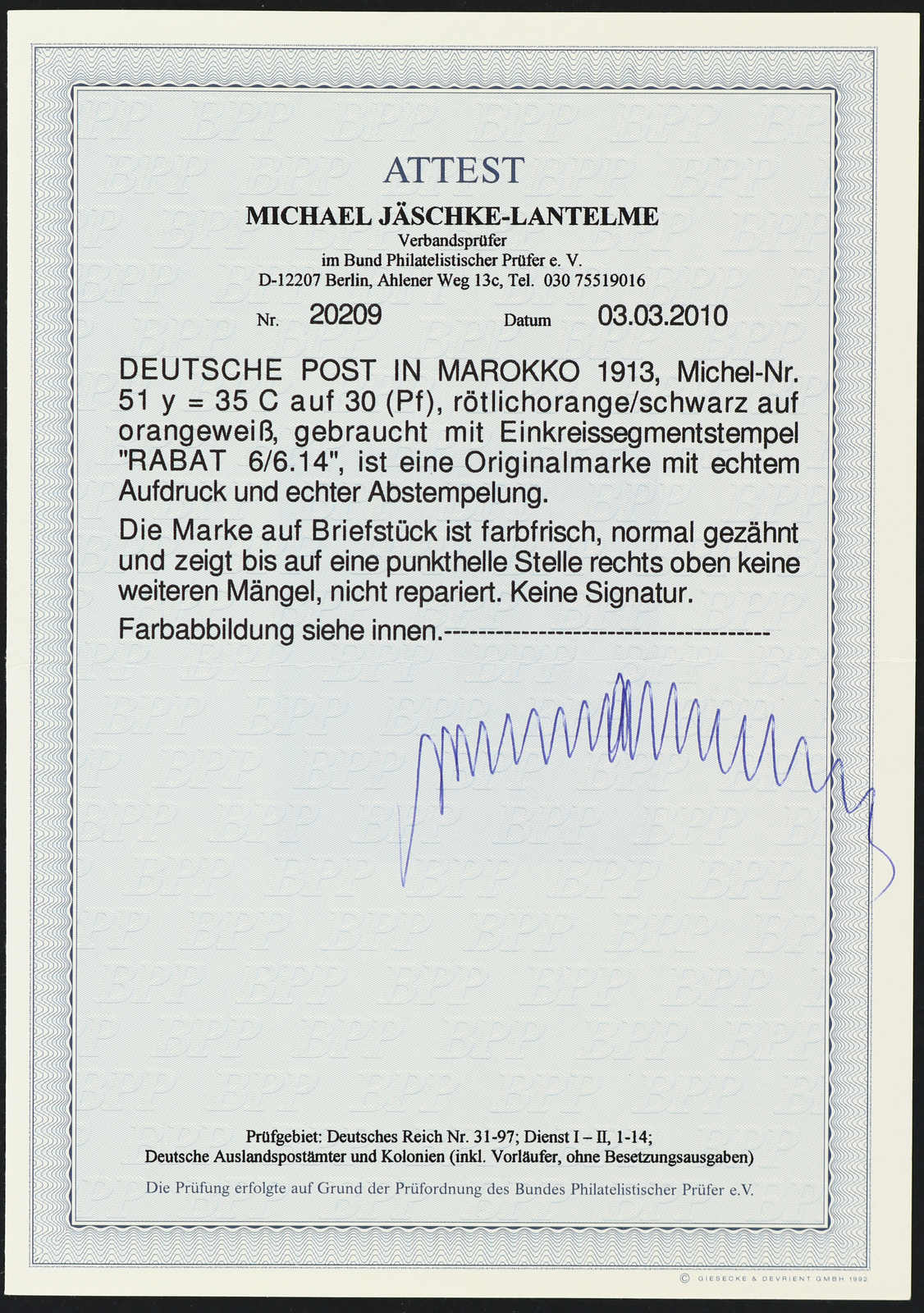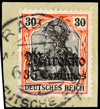 649 Briefst. Michel:51y image1913, 35 C. auf 30 Pfg. Aufdruckausgabe rötlichorange/schwarz auf orangeweiß, klar gestempelt "RABAT 6/6.14" auf Briefstück, farbfrisch, punkthelle Stelle rechts oben, Fotoattest Jäschke-Lantelme BPP (ME 1.800,-) (Image) (imagea)