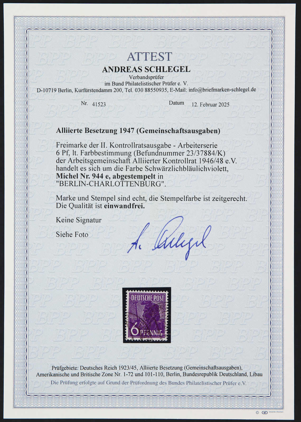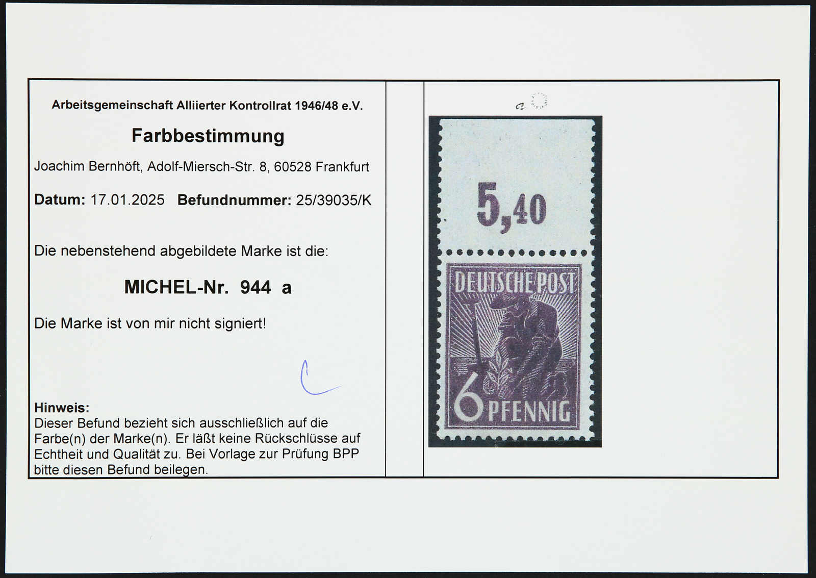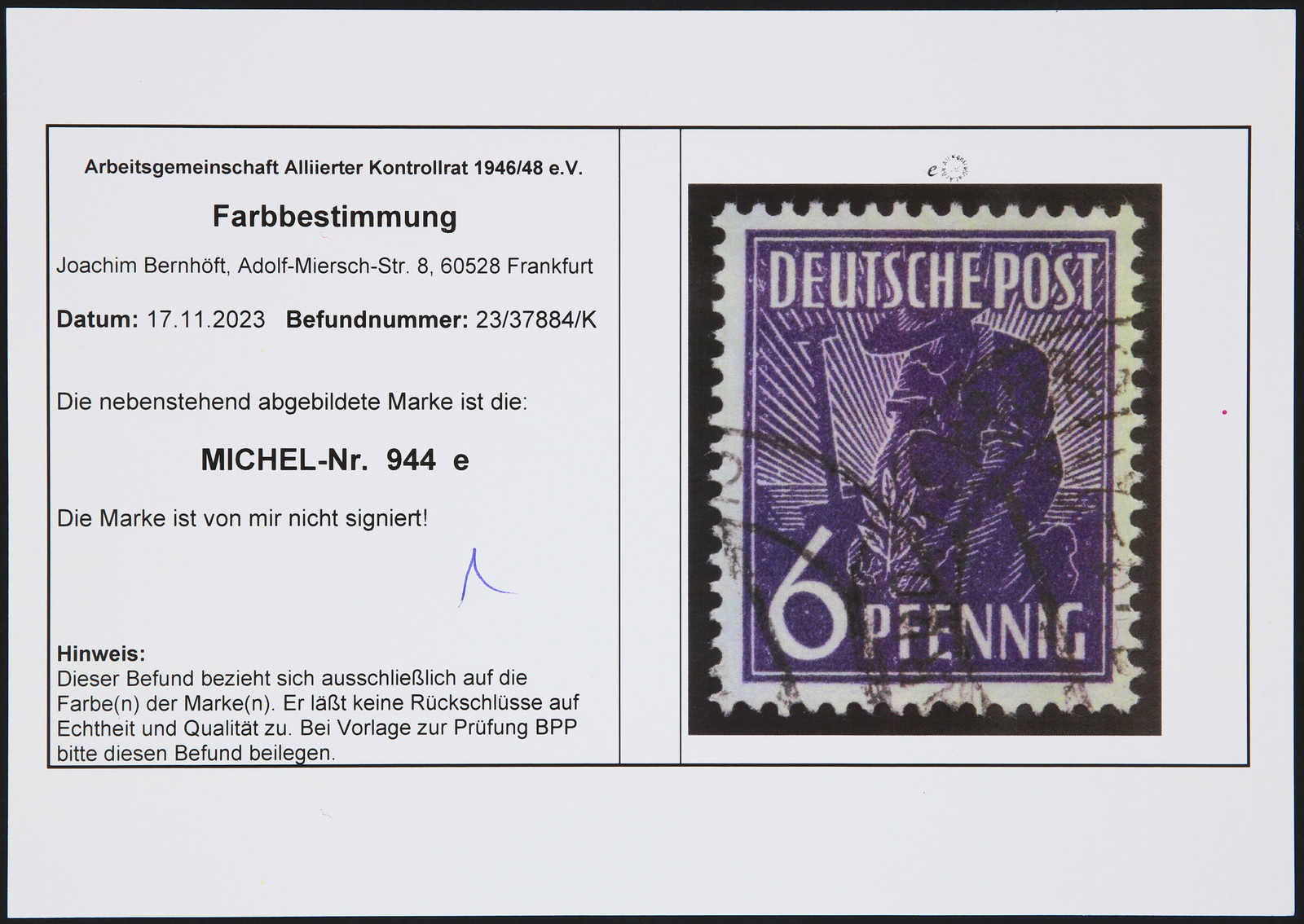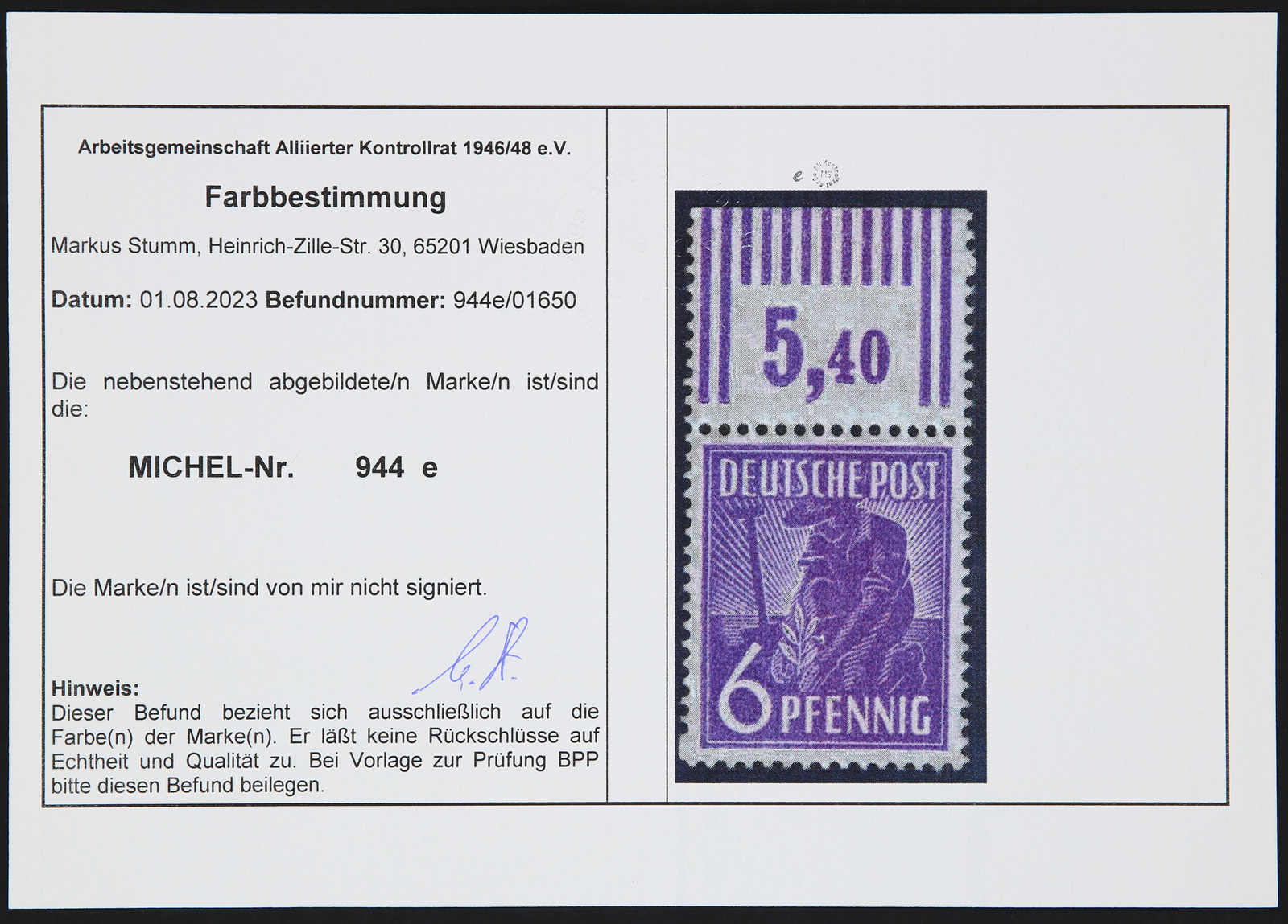 Get Market Data for [Germany (Allied Occupation Zones) Michel: 944 e] Visual Pricing Guide Sample Census