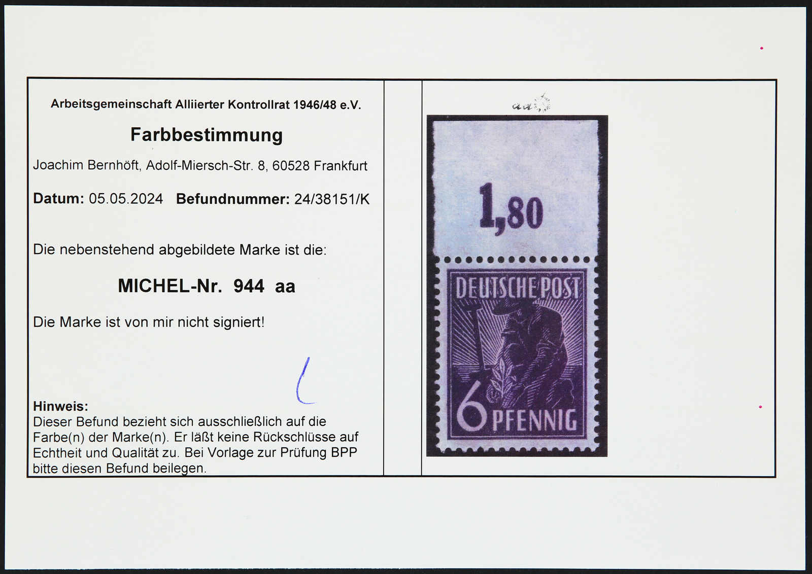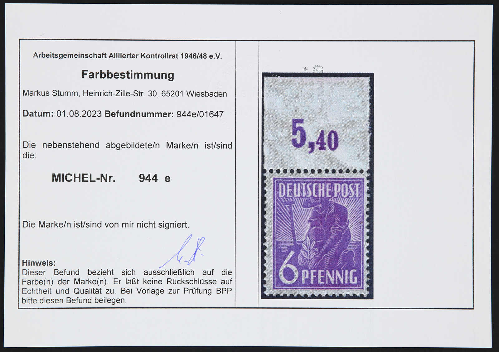 Get Market Data for [Germany (Allied Occupation Zones) Michel: 944 e WOR] Visual Pricing Guide Sample Census