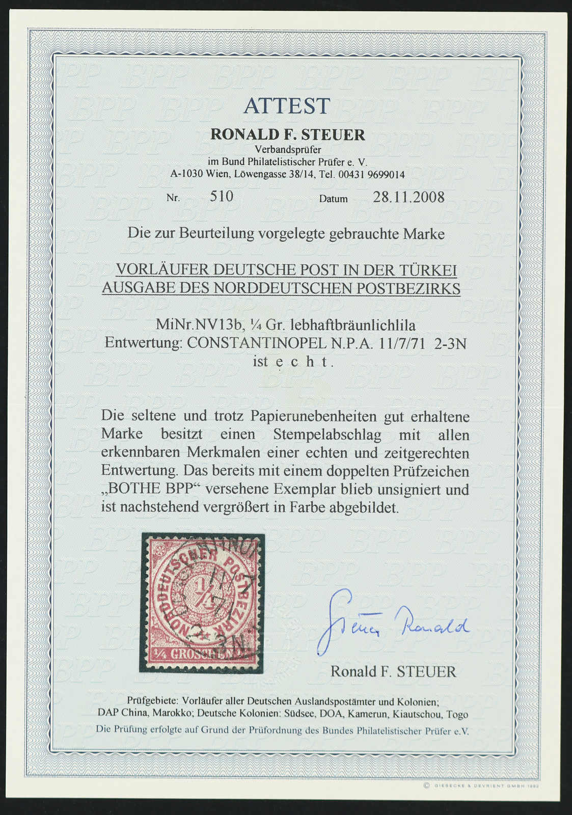 1871, ¼ Gr. lebhaftbräunlichlila, gestempelt "CONSTANTINOPEL N.P.A. 11/7 71", Papierunebenheiten, gute Qualität, geprüft Bothe BPP, Fotoattest Steuer BPP (ME 2.500,-) (Image) (imagea)