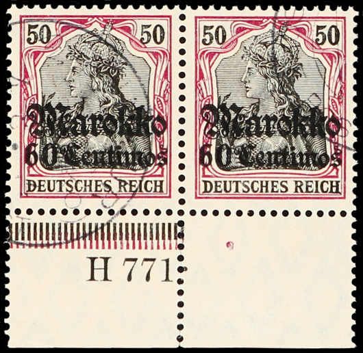 1911, 60 C. auf 50 Pfg. dunkelbräunlichlila/schwarz auf mattchromgelb gestempelt, waagerechtes Paar vom Unterrand mit der HAN H 771, farbfrisch und gut gezähnt, senkrechte Perforation leicht angebogen und unten angetrennt (ME für gest.
