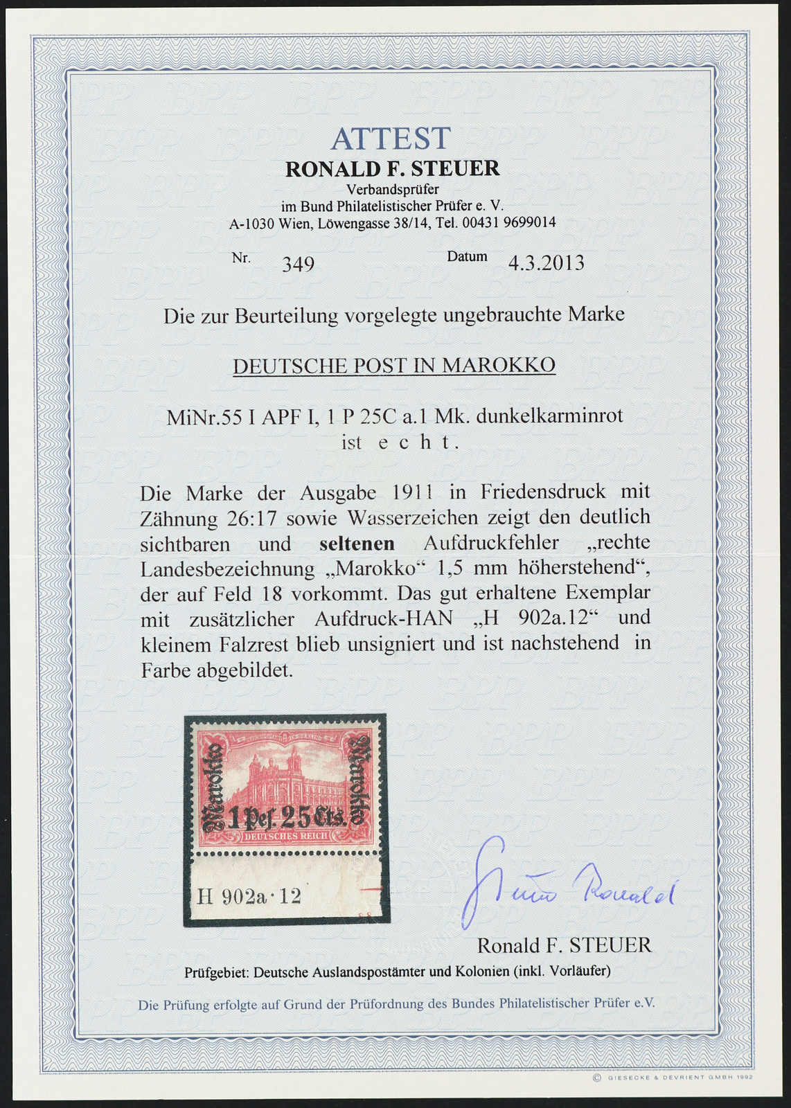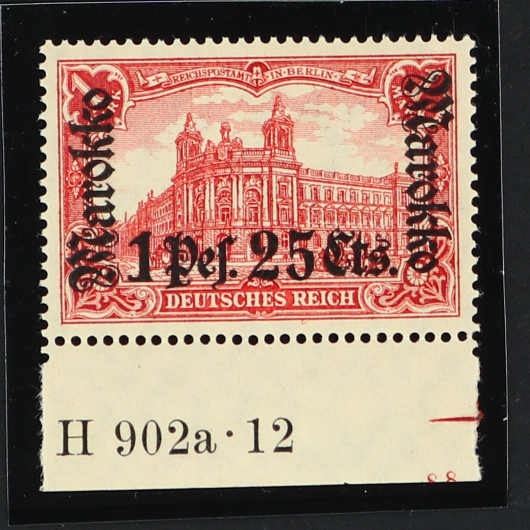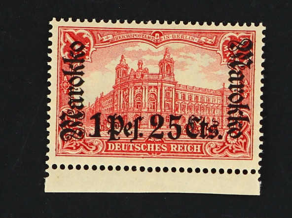 1911, 1 P. 25 C. auf 1 M. Aufdruckausgabe dunkelkarminrot, Friedensdruck, 26:17 Zähnungslöcher, mit Aufdruckfehler "rechte Landesbezeichnung Marokko 1,5 mm höher stehend", ungebrauchtes Exemplar vom Unterrand mit Aufdruck-HAN 902a.12,