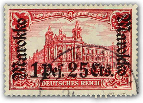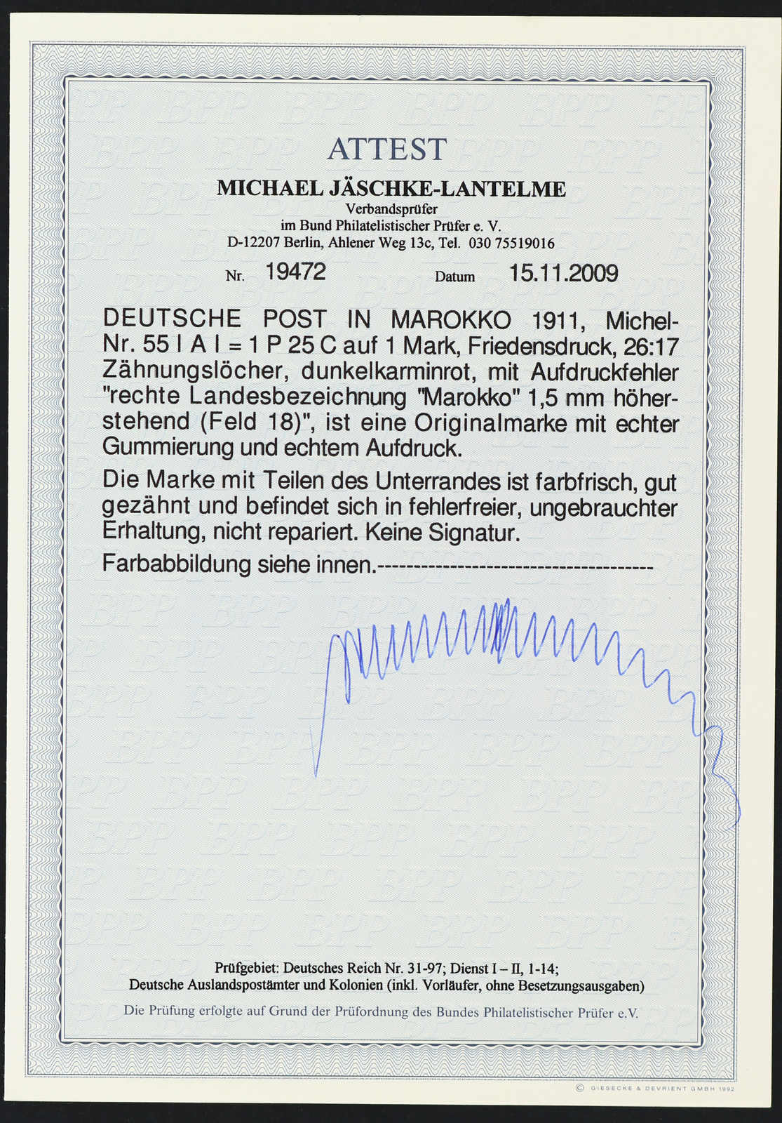 1911, 1 P. 25 C. auf 1 M. Aufdruckausgabe dunkelkarminrot, Friedensdruck, 26:17 Zähnungslöcher, mit Aufdruckfehler "rechte Landesbezeichnung Marokko 1,5 mm höher stehend", ungebraucht, einwandfrei, Fotoattest Jäschke-Lantelme BPP (ME