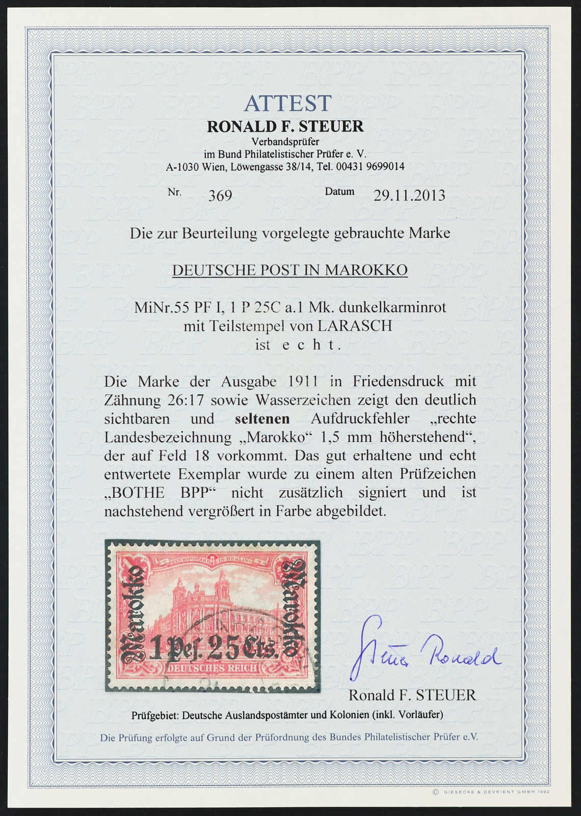 1911, 1 P. 25 C. auf 1 M. Aufdruckausgabe dunkelkarminrot, Friedensdruck, 26:17 Zähnungslöcher, mit Aufdruckfehler "rechte Landesbezeichnung Marokko 1,5 mm höher stehend", gestempelt "LARASCH", einwandfrei, geprüft Bothe BPP, Fotoattest