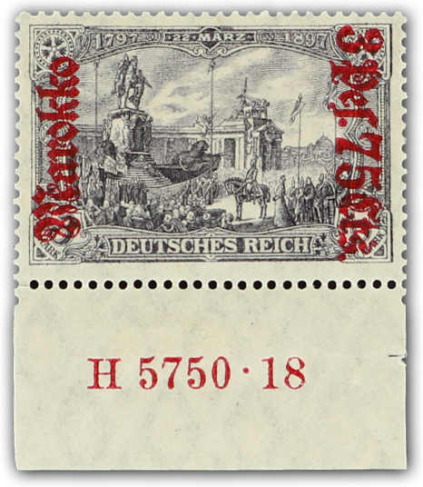 1918, 3 P. 75 C. auf 3 M. Aufdruckausgabe schwarzviolettgrau, Aufdruck dunkellilarot, Kriegsdruck, 25:17 Zähnungslöcher, postfrisches Exemplar vom Unterrand mit Aufdruck-HAN 5750.18, farbfrisch und einwandfrei, der Ordnung halber sei